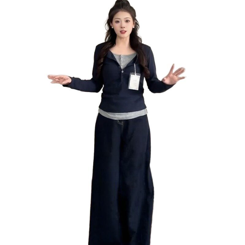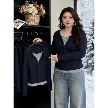 大码高级感假两件长袖t恤女2026年新款胖mm修身显瘦百搭打底上衣