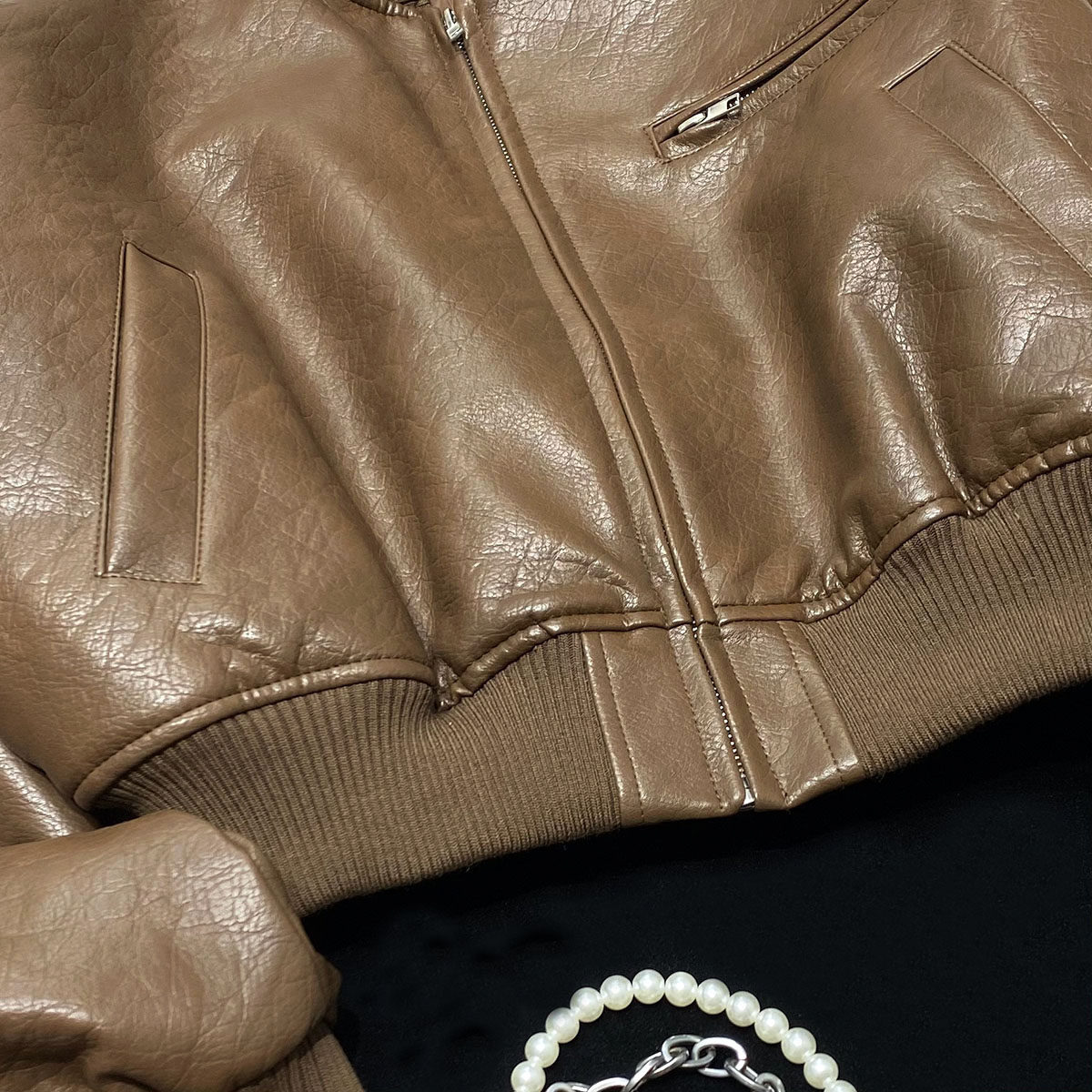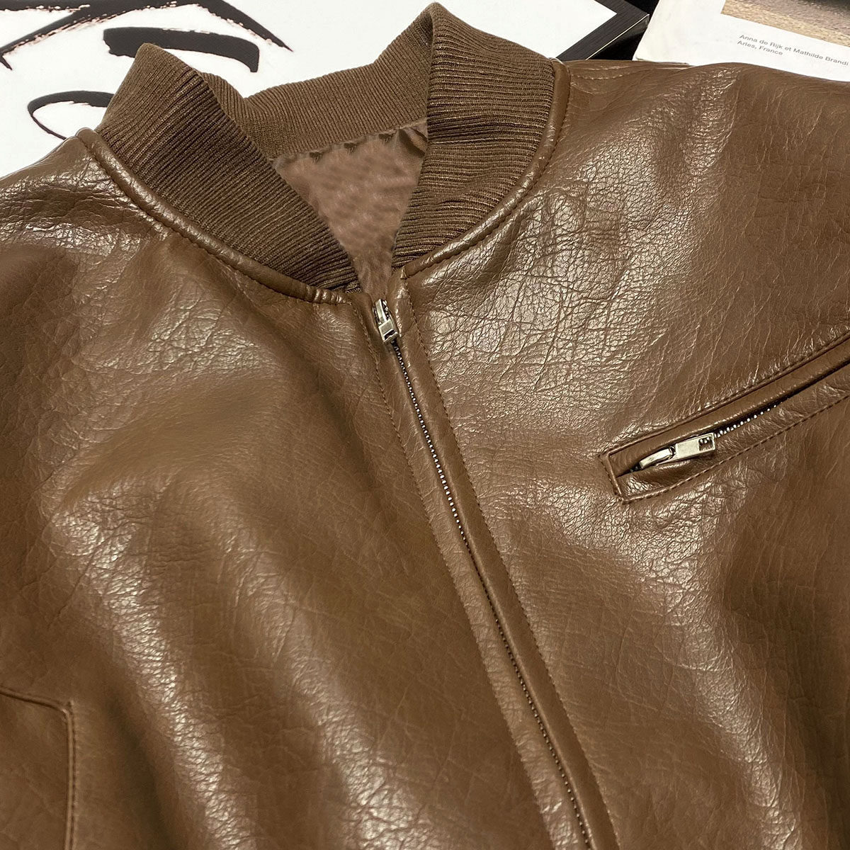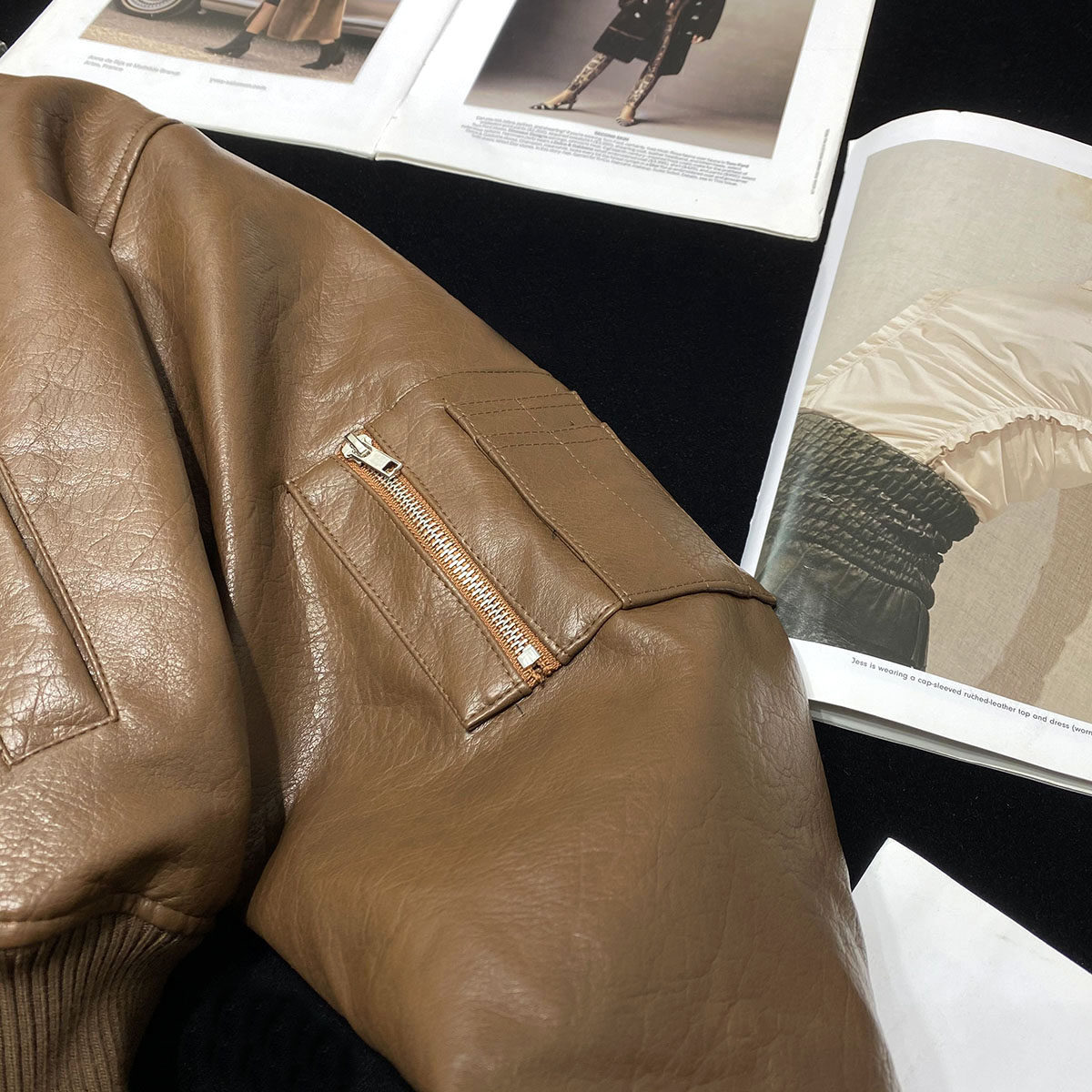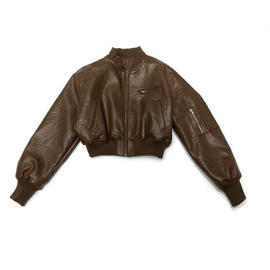 CCA自制辣妹夹棉飞行员皮衣夹克外套棕色PU皮短款加厚MA1棒球服女