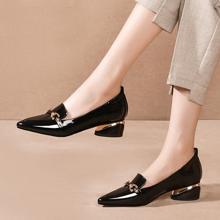 思卡琪中跟单鞋女尖头粗跟百搭时尚女鞋真皮新款小皮鞋漆皮大码鞋