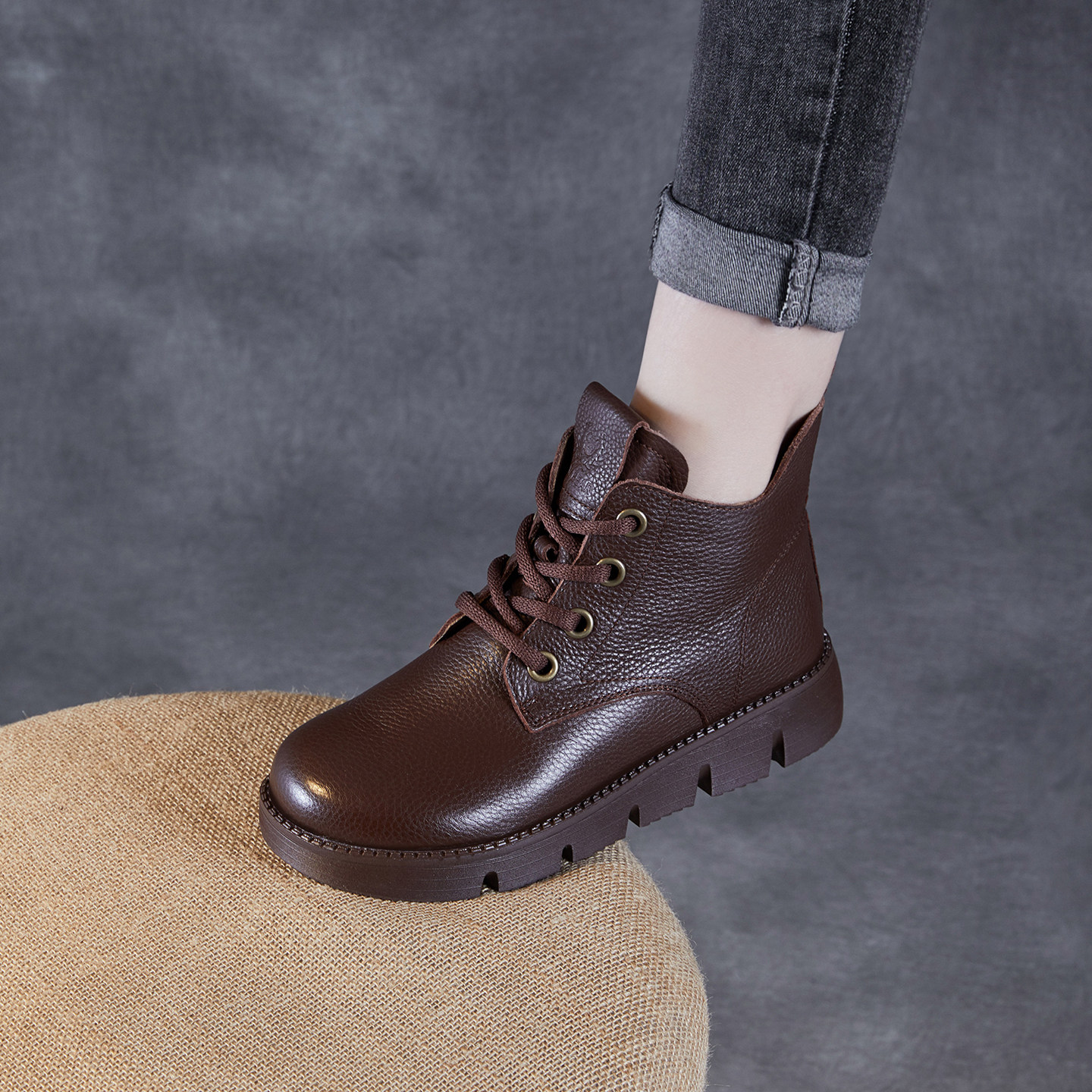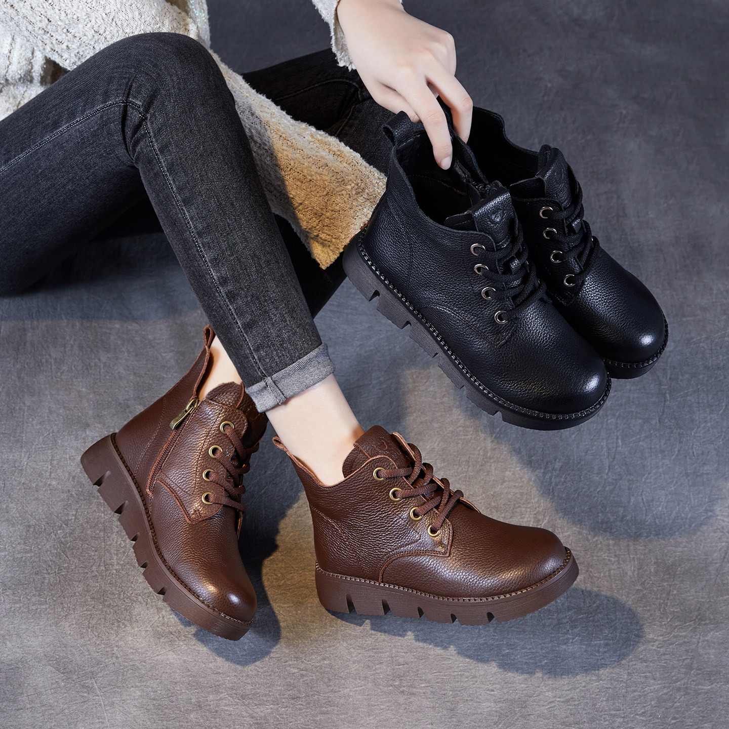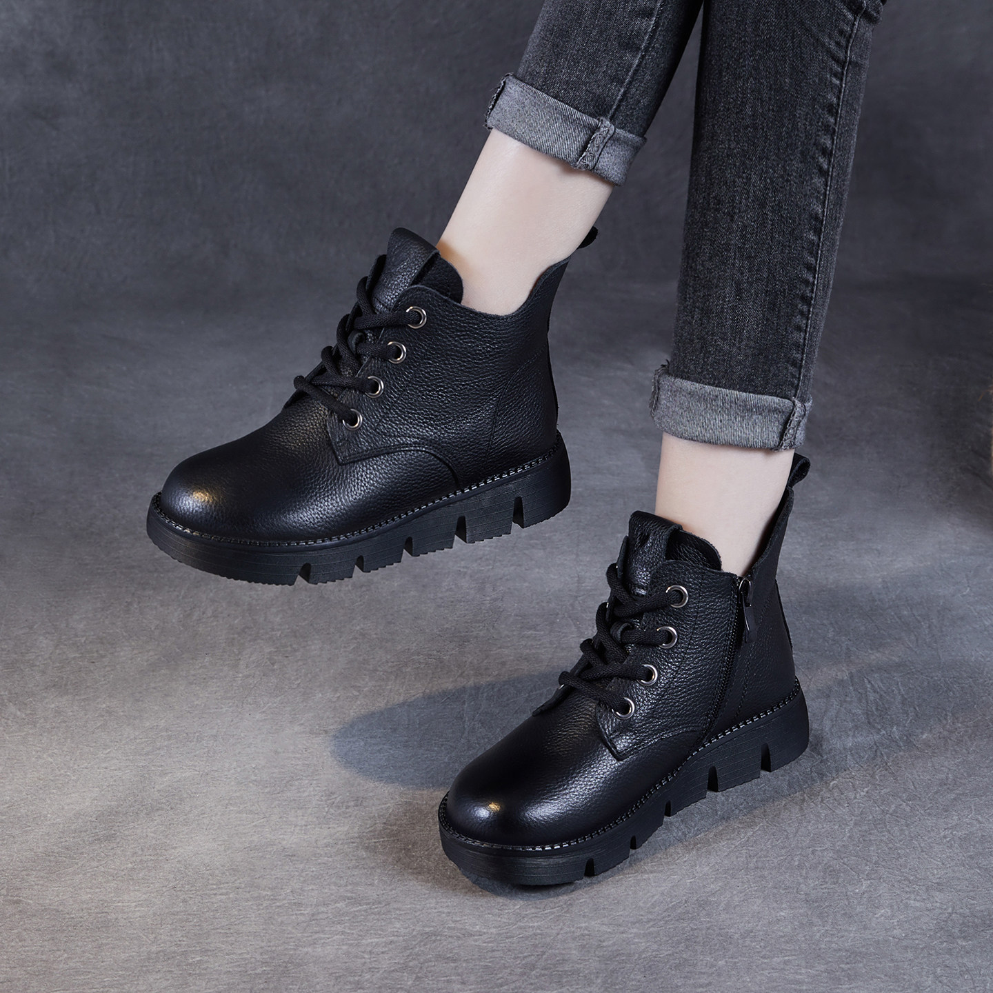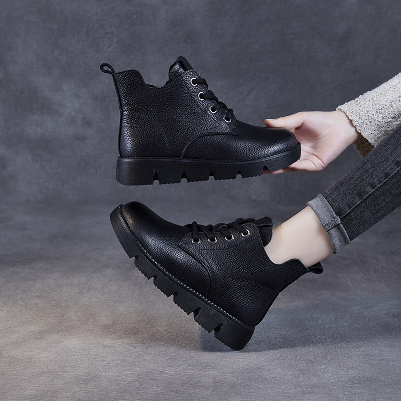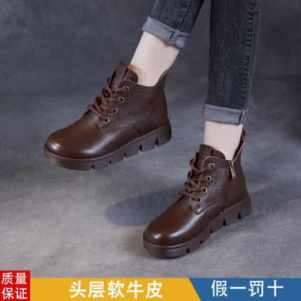 全真皮牛皮复古马丁靴女短靴女冬季加绒平底单靴妈妈鞋英伦风防滑