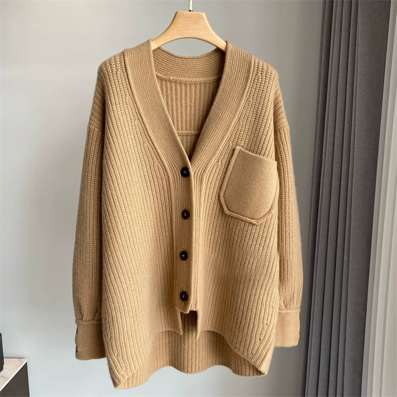 重磅加厚V领100%纯羊毛开衫女中长款宽松针织毛衣外套羊绒衫上衣