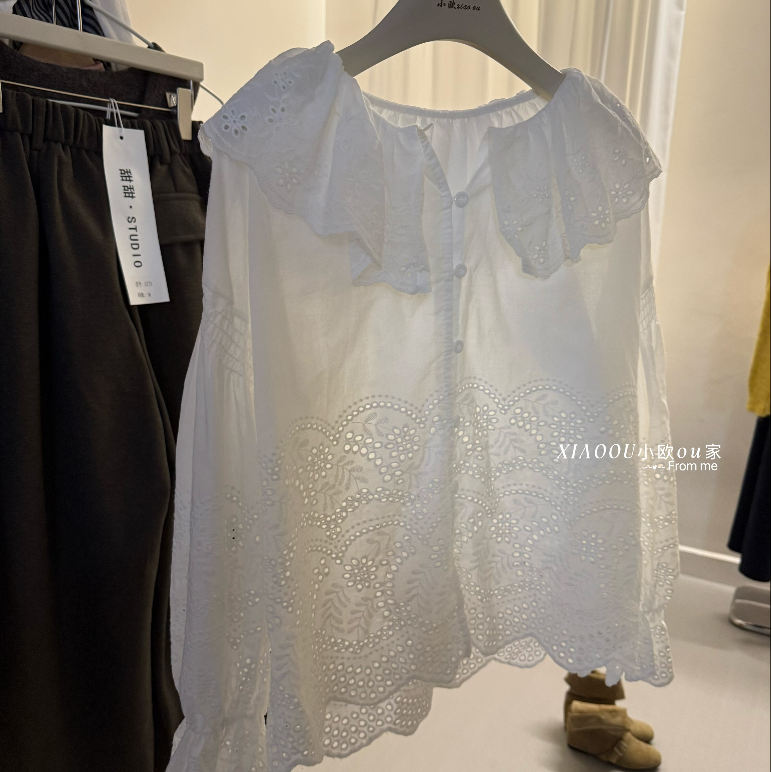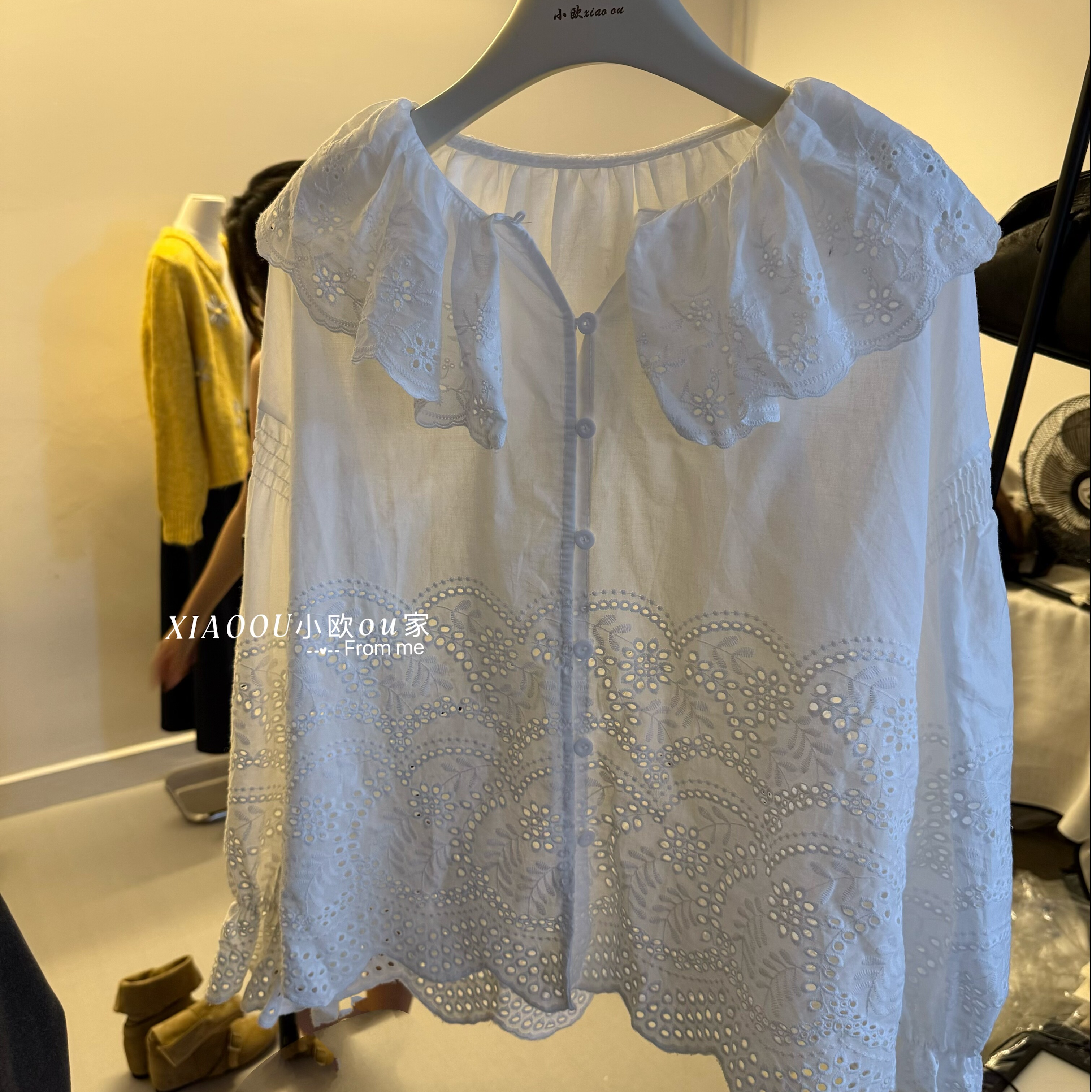 法式小众25秋季新镂空刺绣拼接圆领衬衫宽松休闲落肩长袖