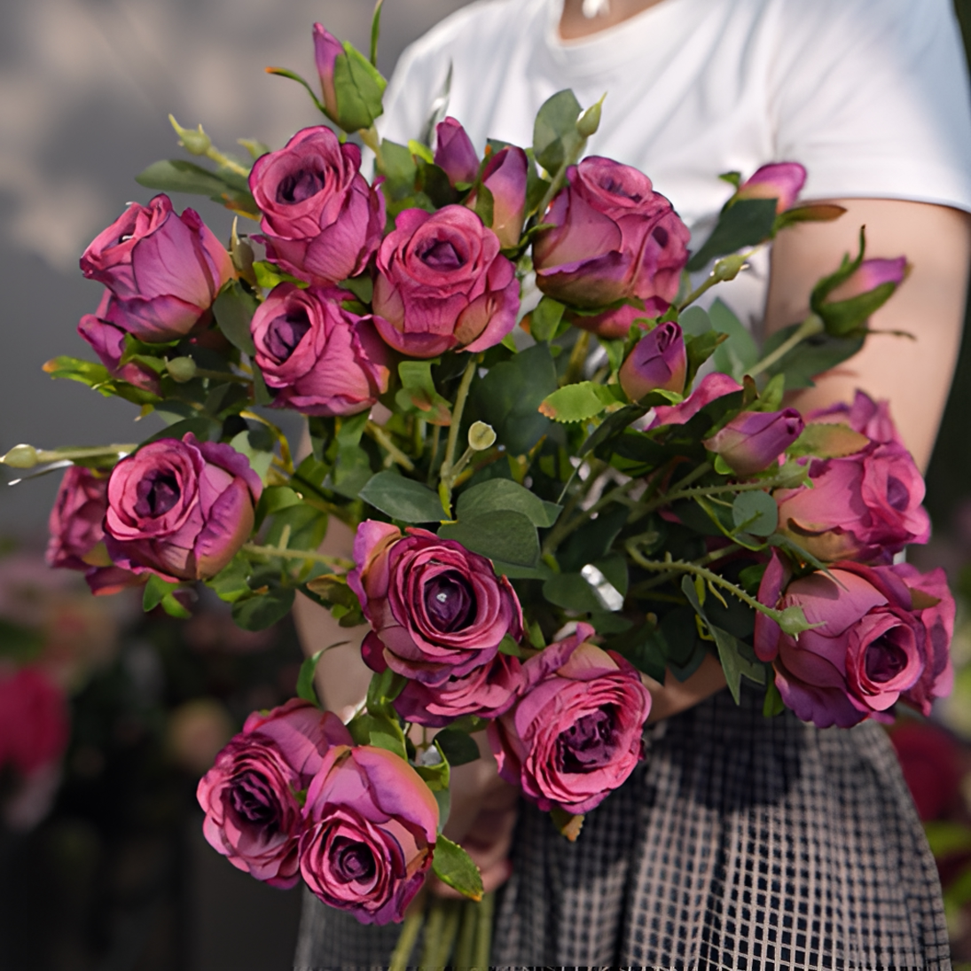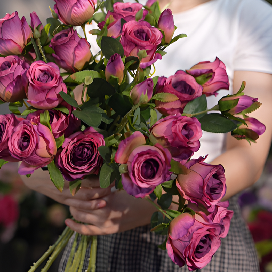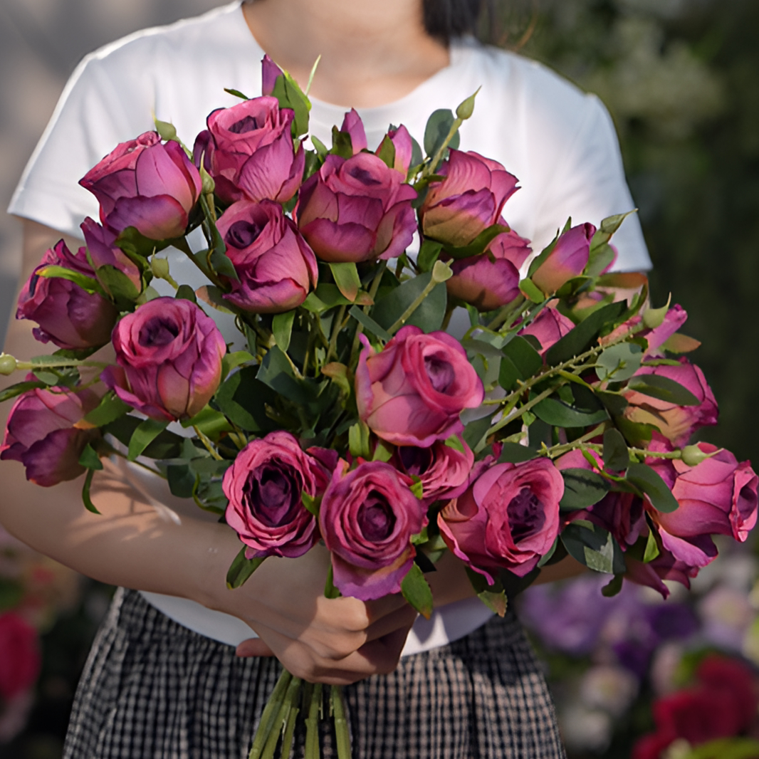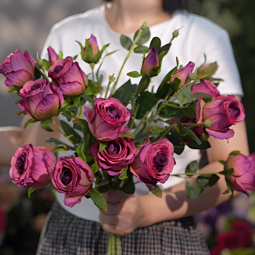 油画玫瑰复古玫红色 仿真花 三头玫瑰花 多头假花 餐桌花 客厅花
