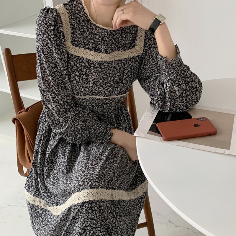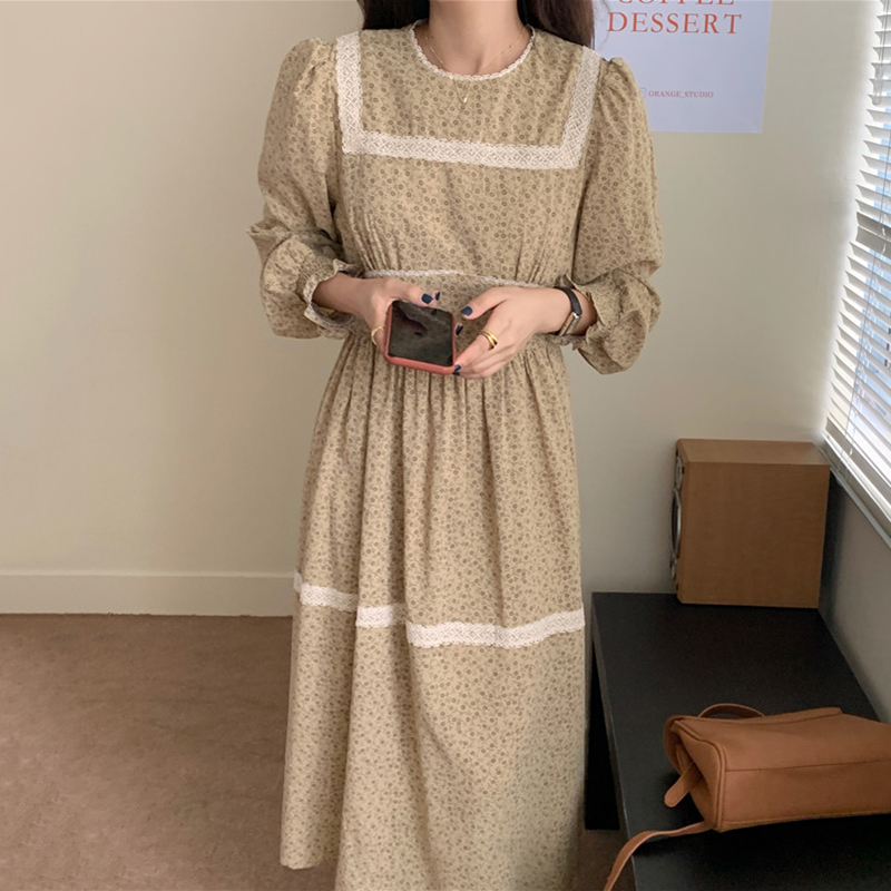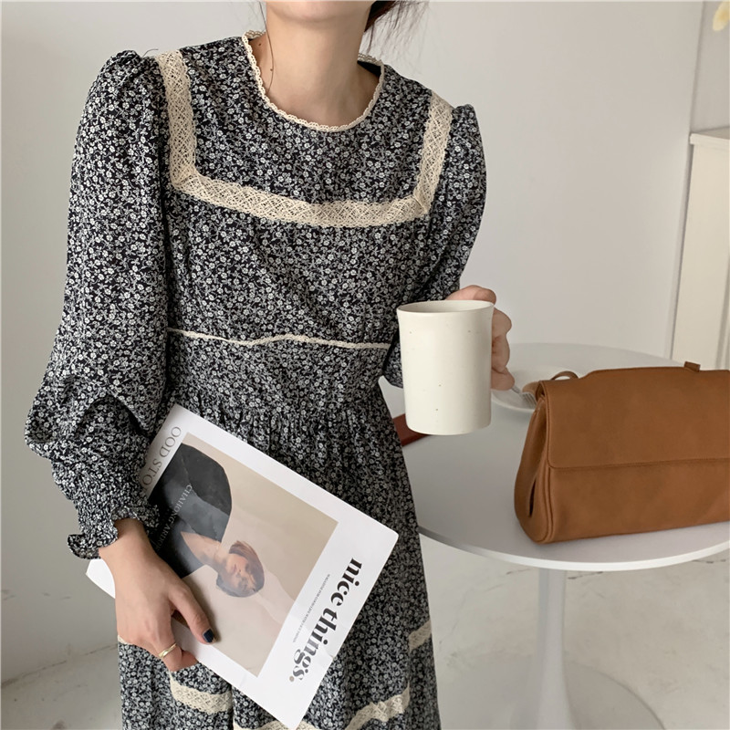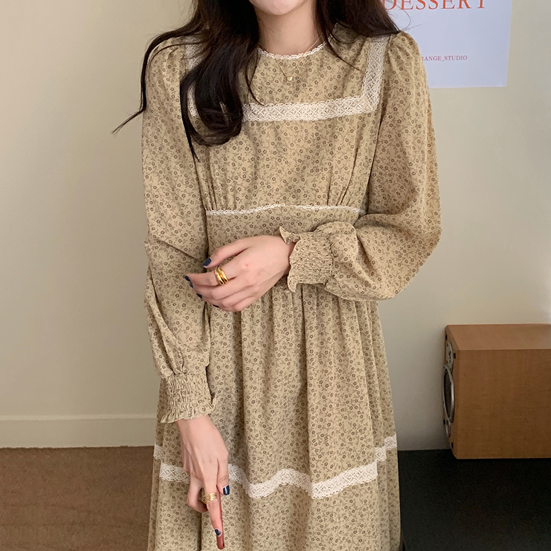 韩国chic法式复古圆领蕾丝花边拼接显瘦高腰宽松长款碎花连衣裙女