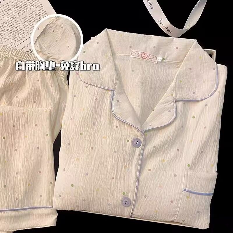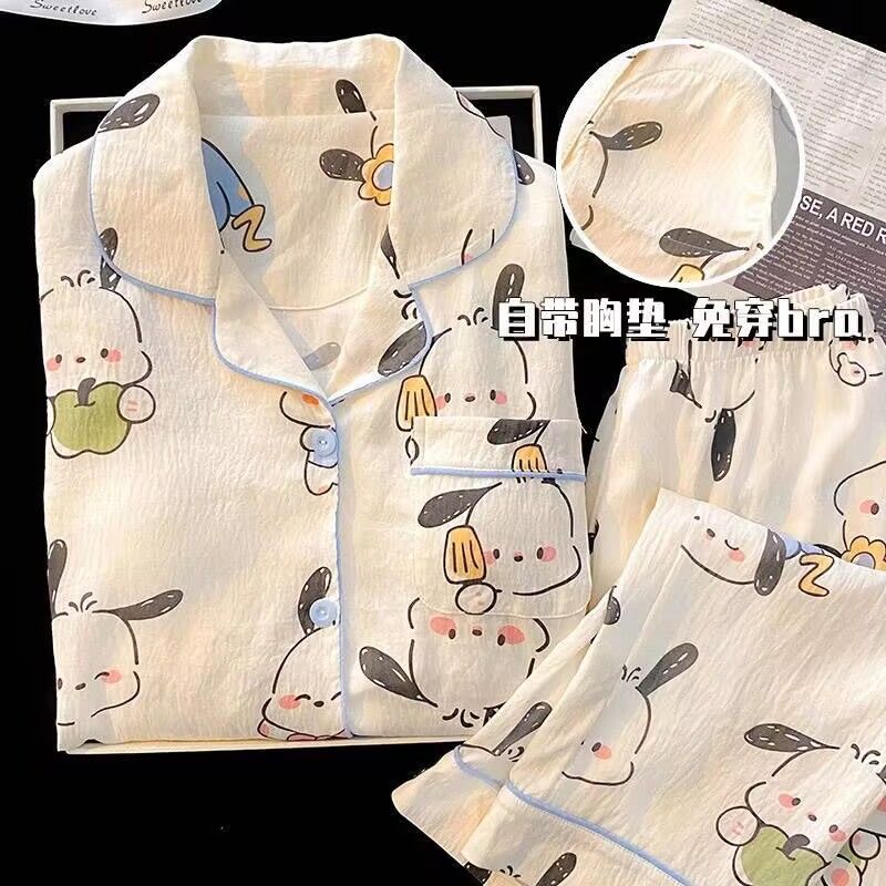 带胸垫睡衣女开衫春秋季2025年新款纯棉纱布卡通小熊家居服套装