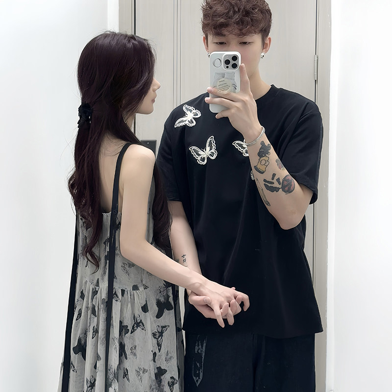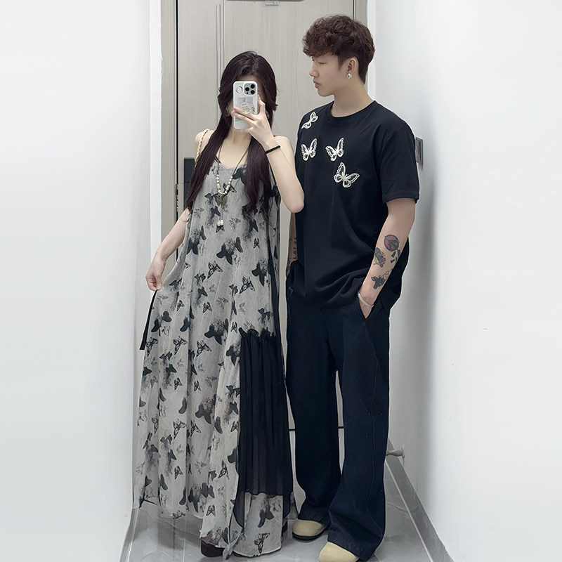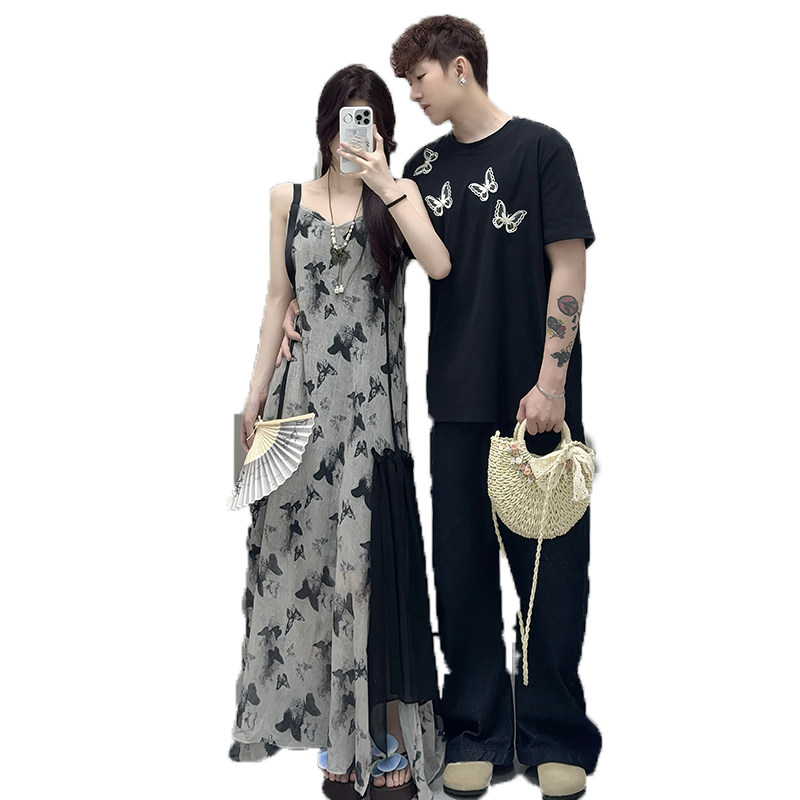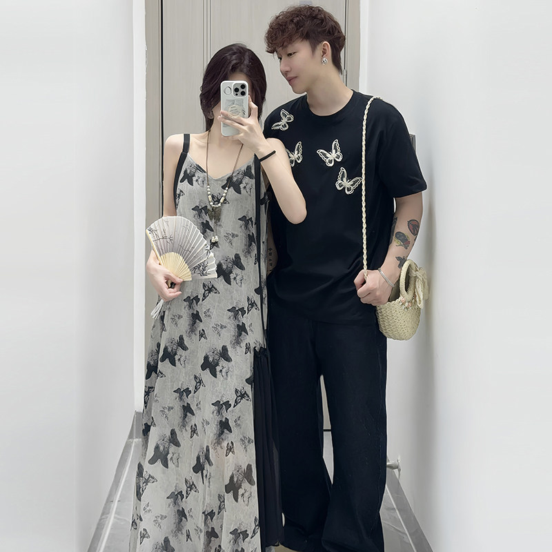 情侣装夏季短袖T恤海边度假沙滩长裙高级法式吊带连衣裙一衣一裙