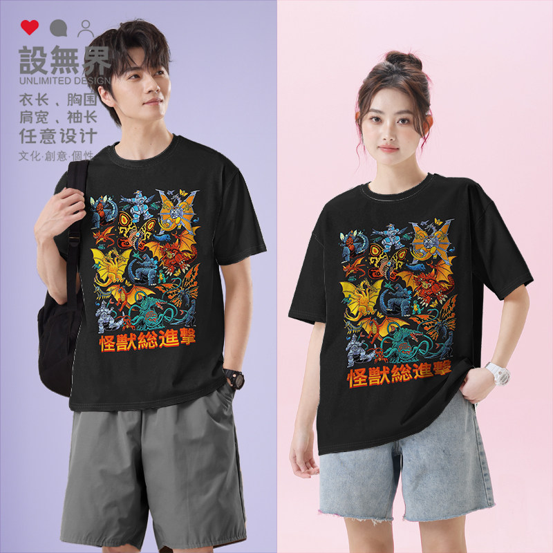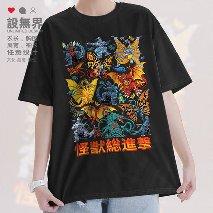 日系插画哥斯拉大家族怪兽总进击周边短袖T恤男女体恤0017设 无界