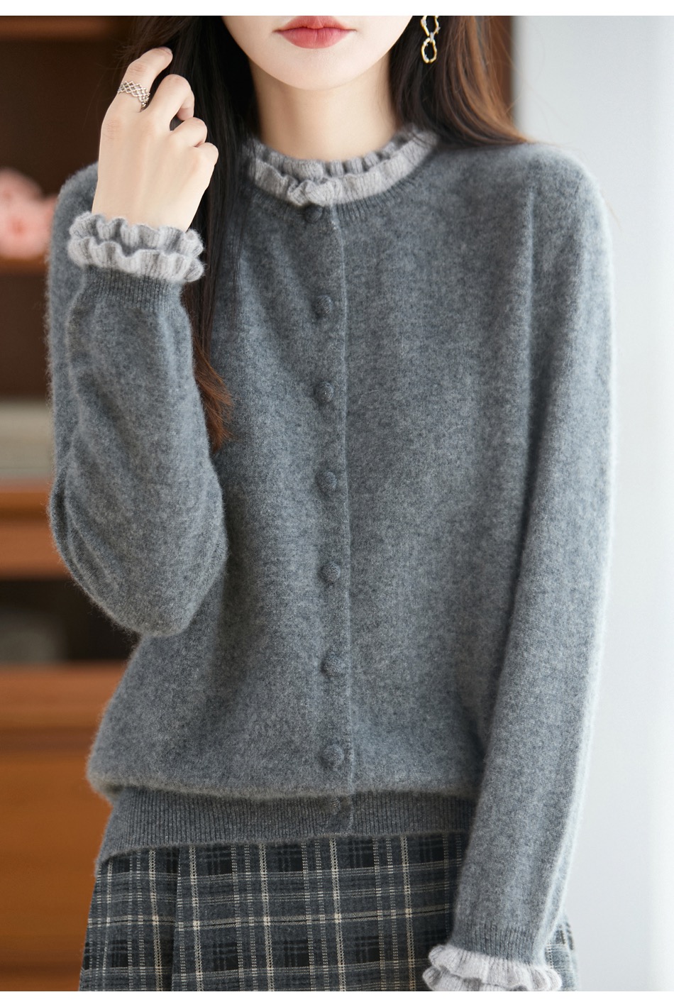 2025新款时尚百搭撞色木耳边圆领软糯亲肤羊毛薄款长袖针织开衫女