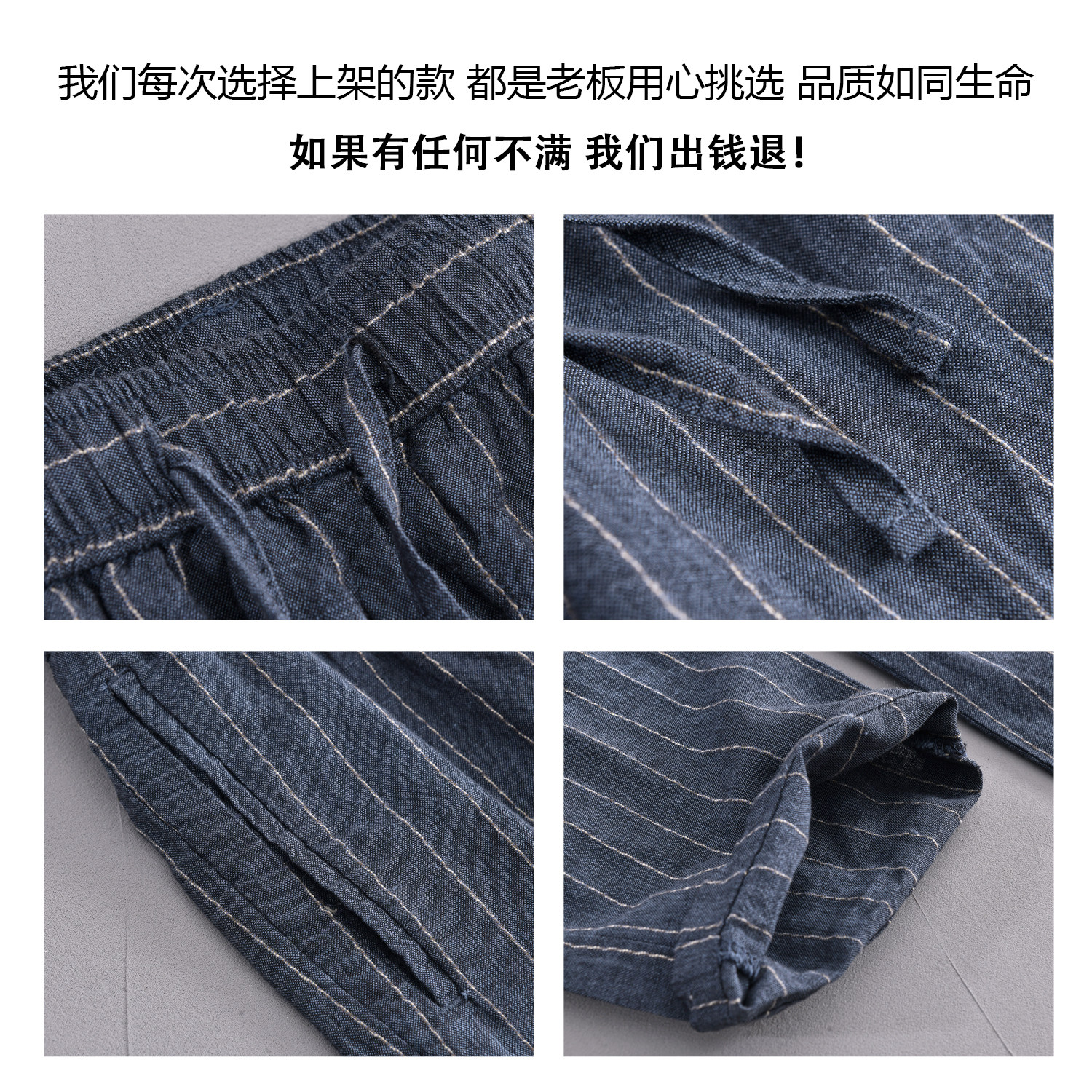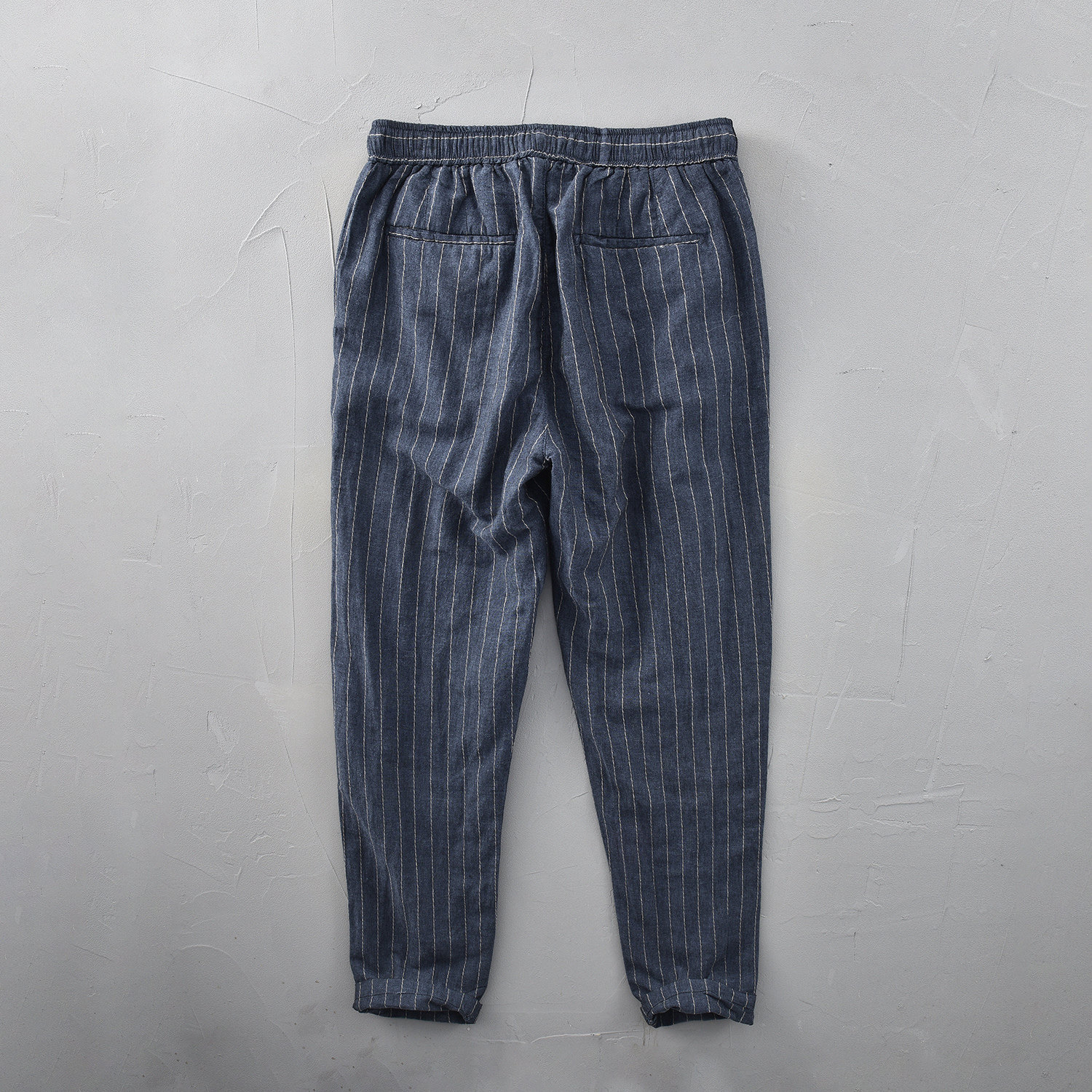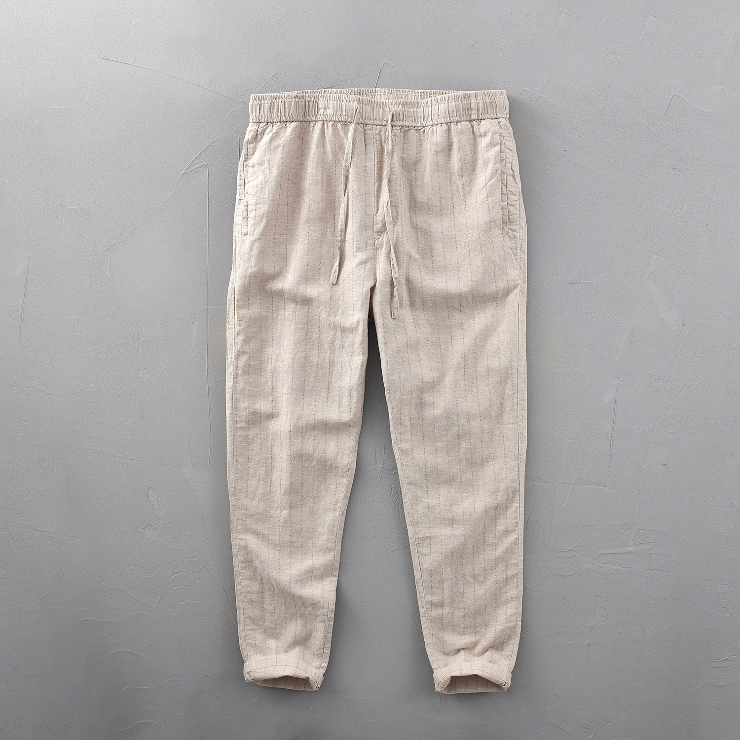 日系条纹亚麻休闲裤男士薄款小脚修身麻料青年直筒收腿棉麻长裤子