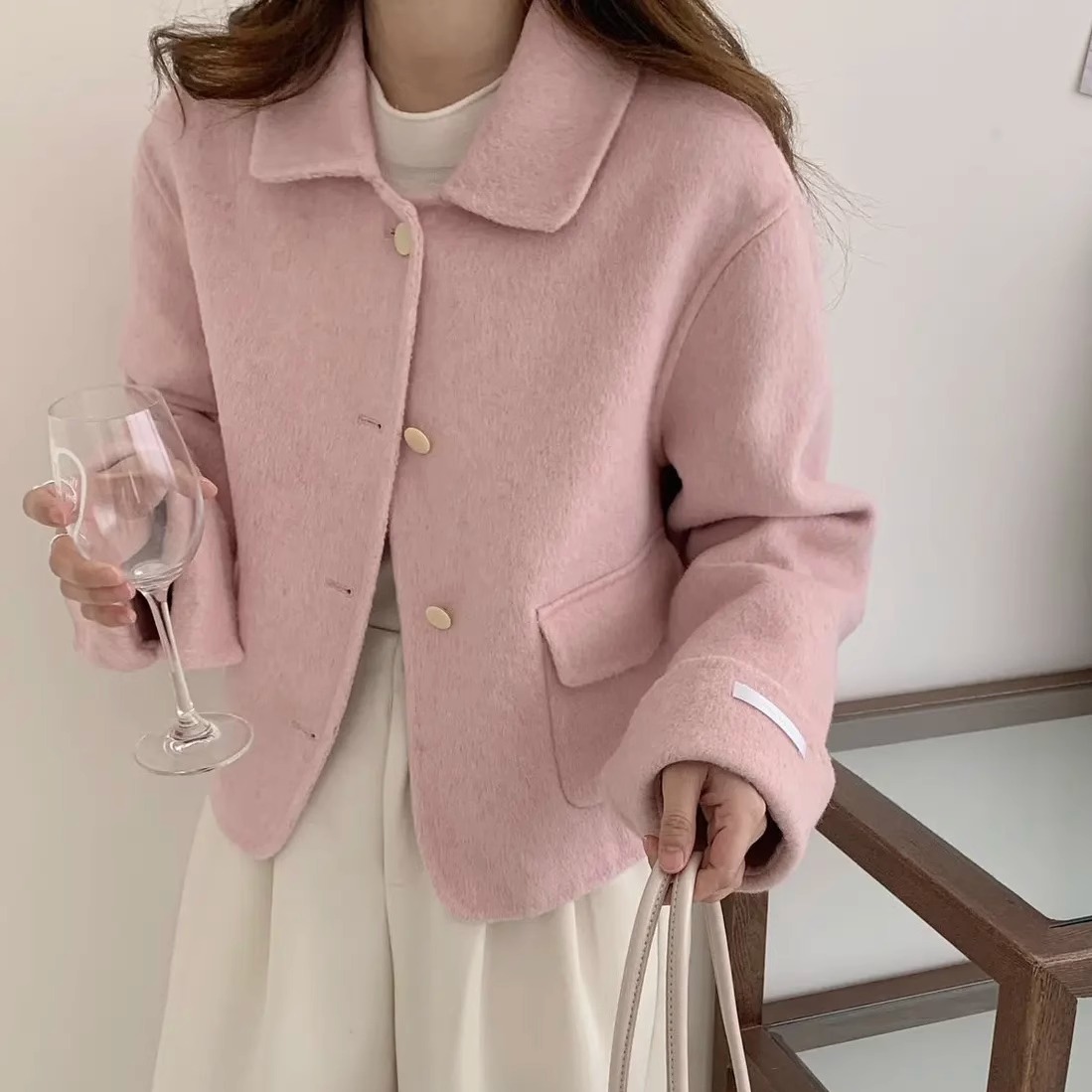 韩系双面羊绒大衣女短款春季新款方领单排扣小个子羊毛呢宽松外套