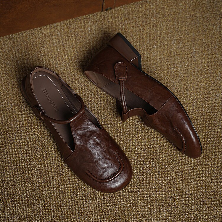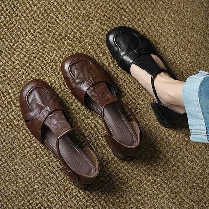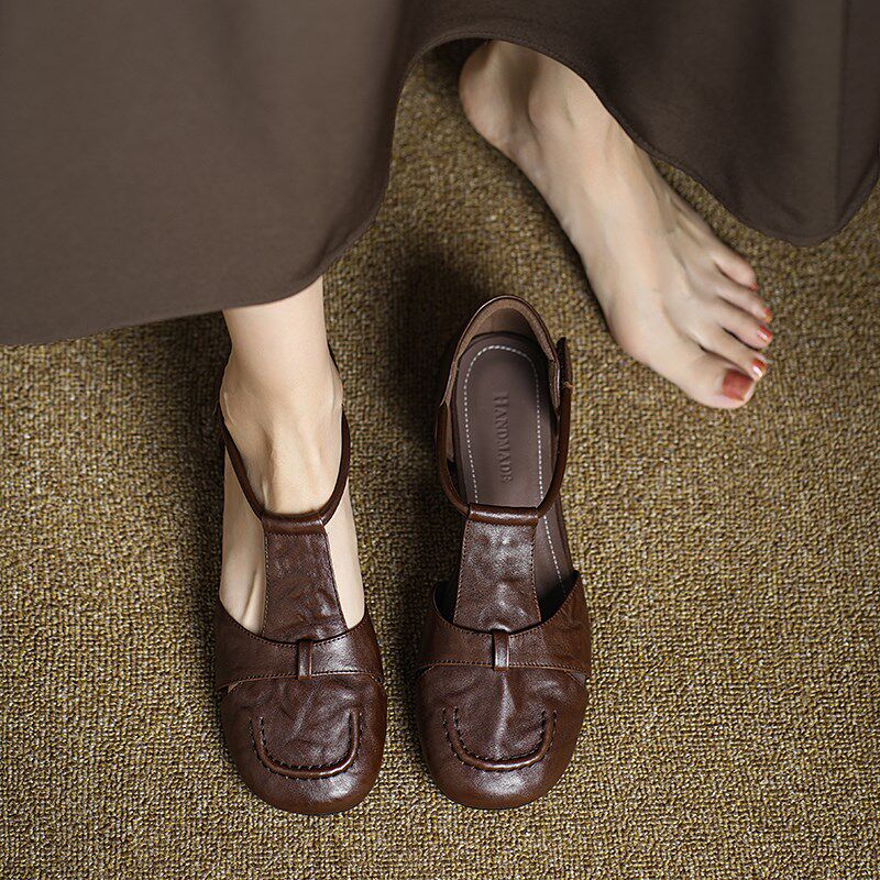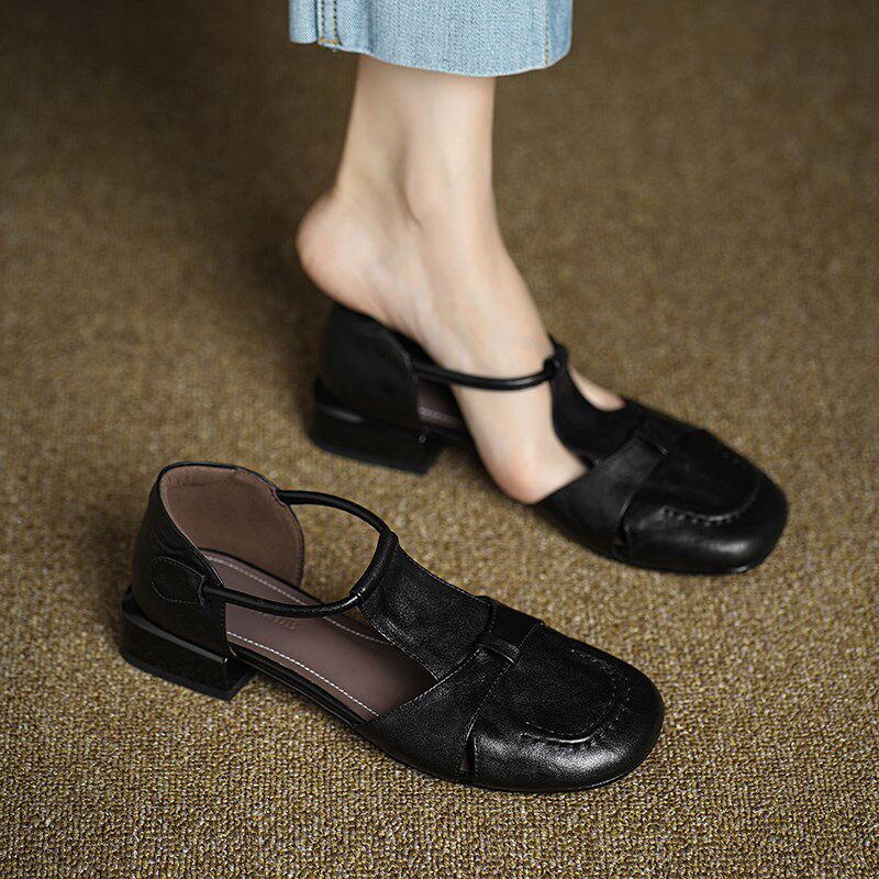2025新款复古风粗跟包头凉鞋女丁字扣配裙子中空玛丽珍鞋文艺单鞋