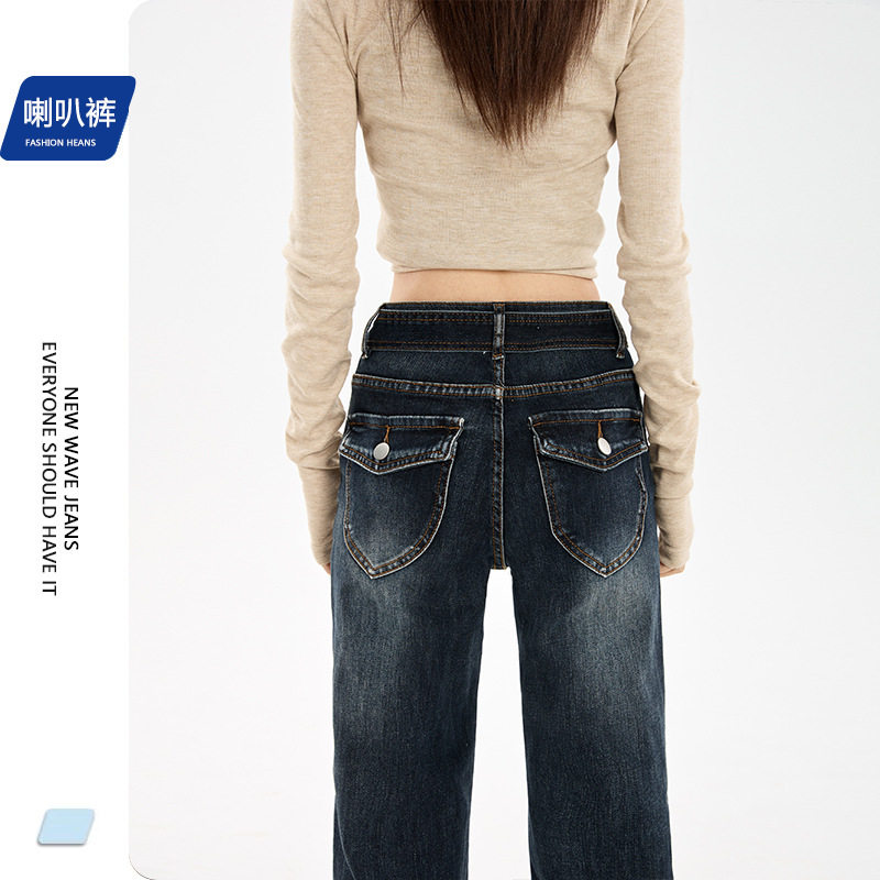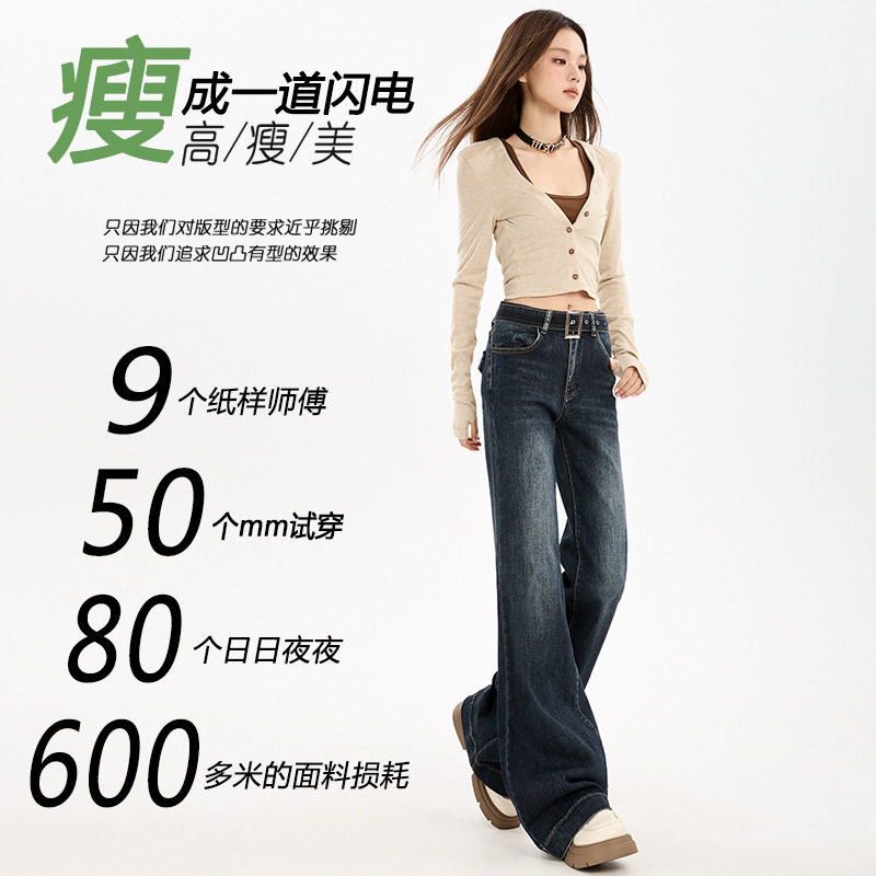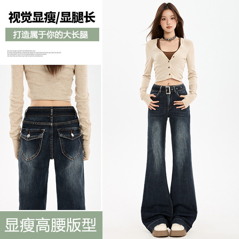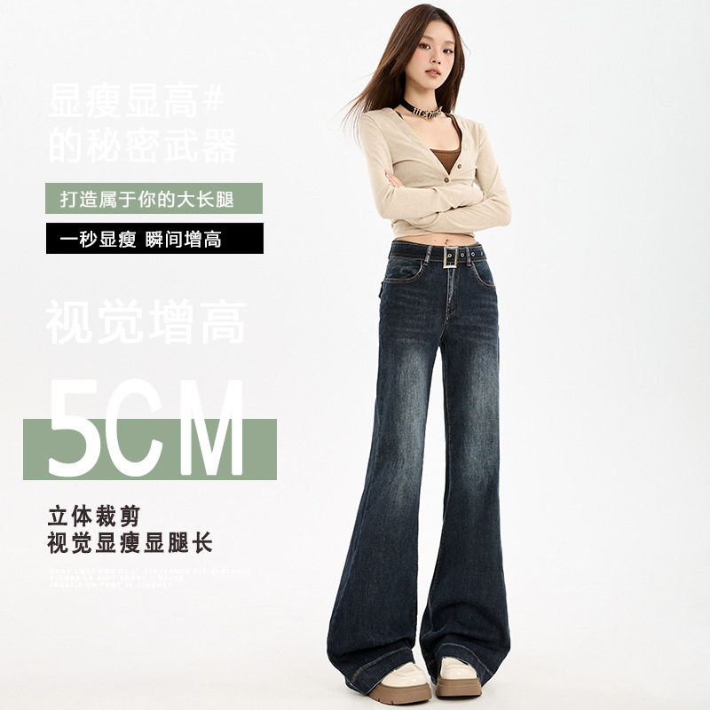 蓝灰色高腰显瘦弹力牛仔喇叭裤女微喇设计感同色腰带
