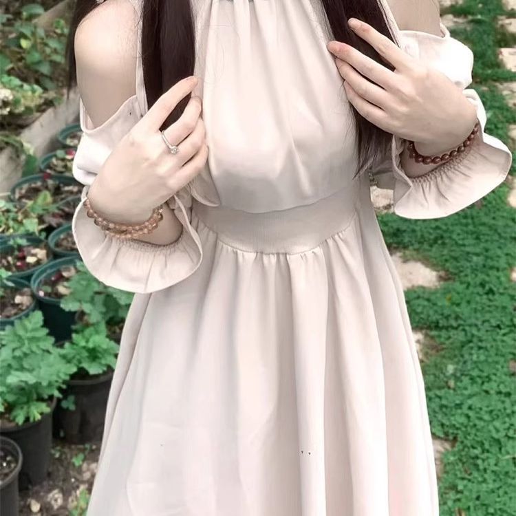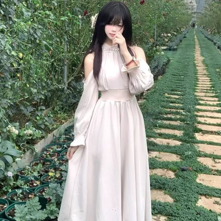 法式温柔露肩连衣裙春秋季2025新款收腰显瘦气质荷叶仙女裙子名媛