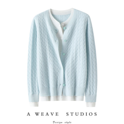 美到骨子里~假两件圆领100%纯山羊绒开衫女纯羊绒毛衣针织外套