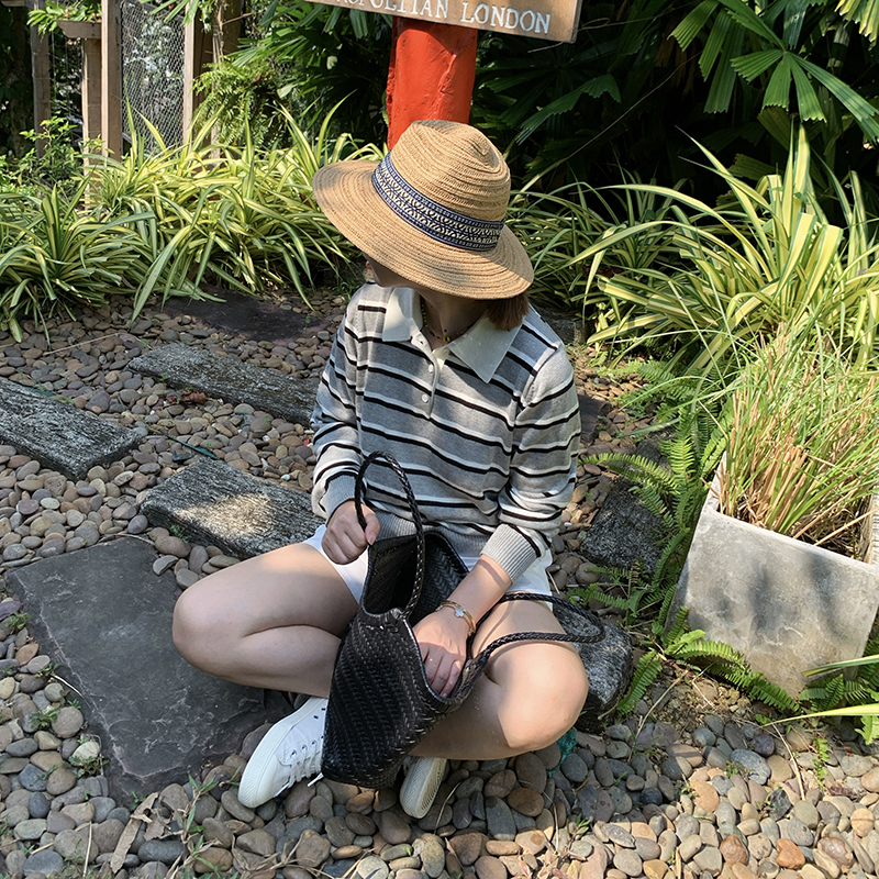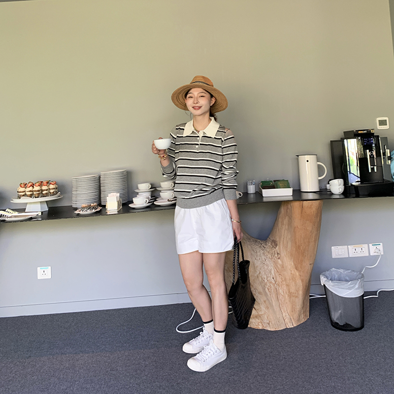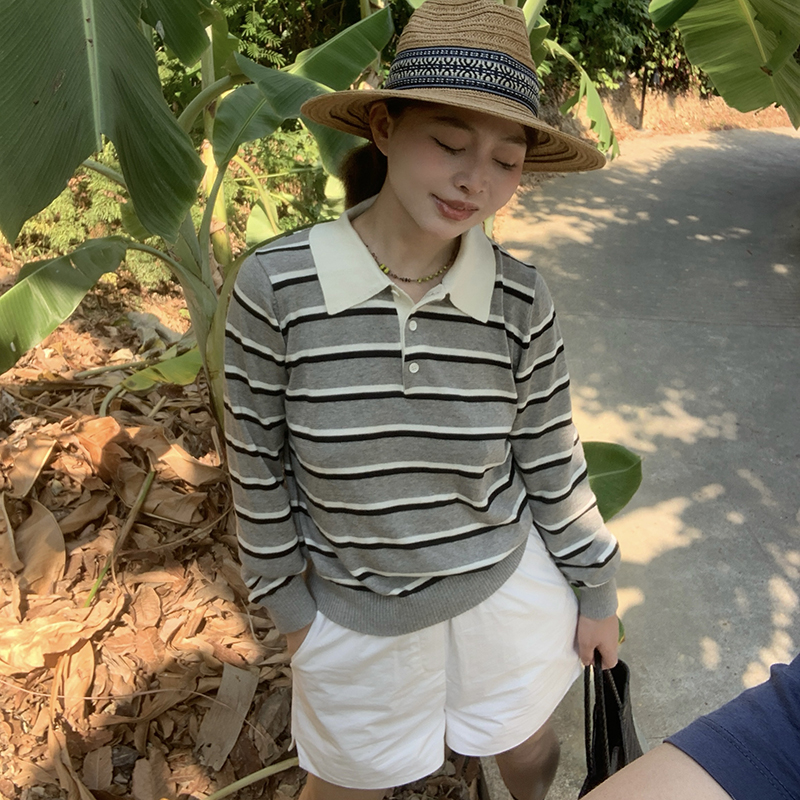 色条纹翻领polo衫长袖针织衫女