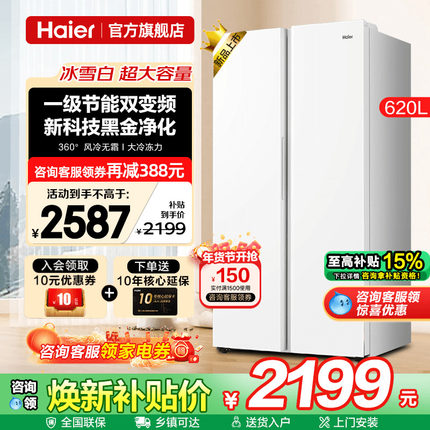 海尔电冰箱620L升白色对开门两双门一级能效家用大容量无霜旗舰店