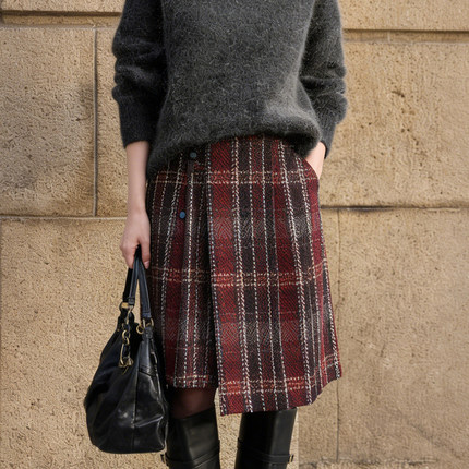 欧货高端定制深红色格纹大码半身裙女2026春季新款加厚轻熟A字裙