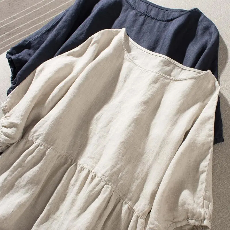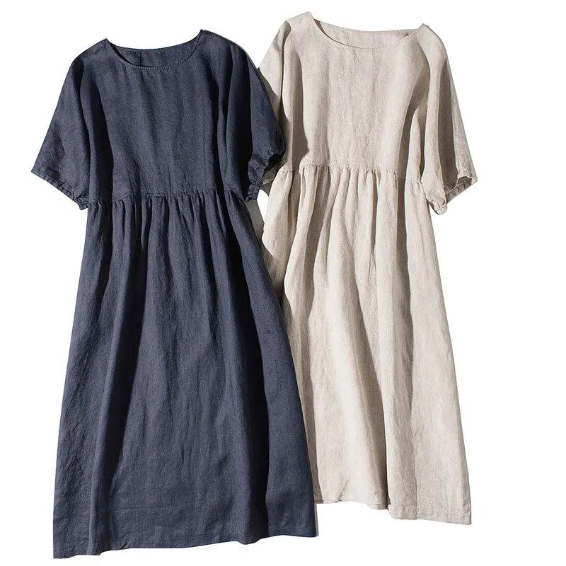 文艺复古棉麻慵懒风纯色简约中长款短袖连衣裙女2025夏季宽松裙子