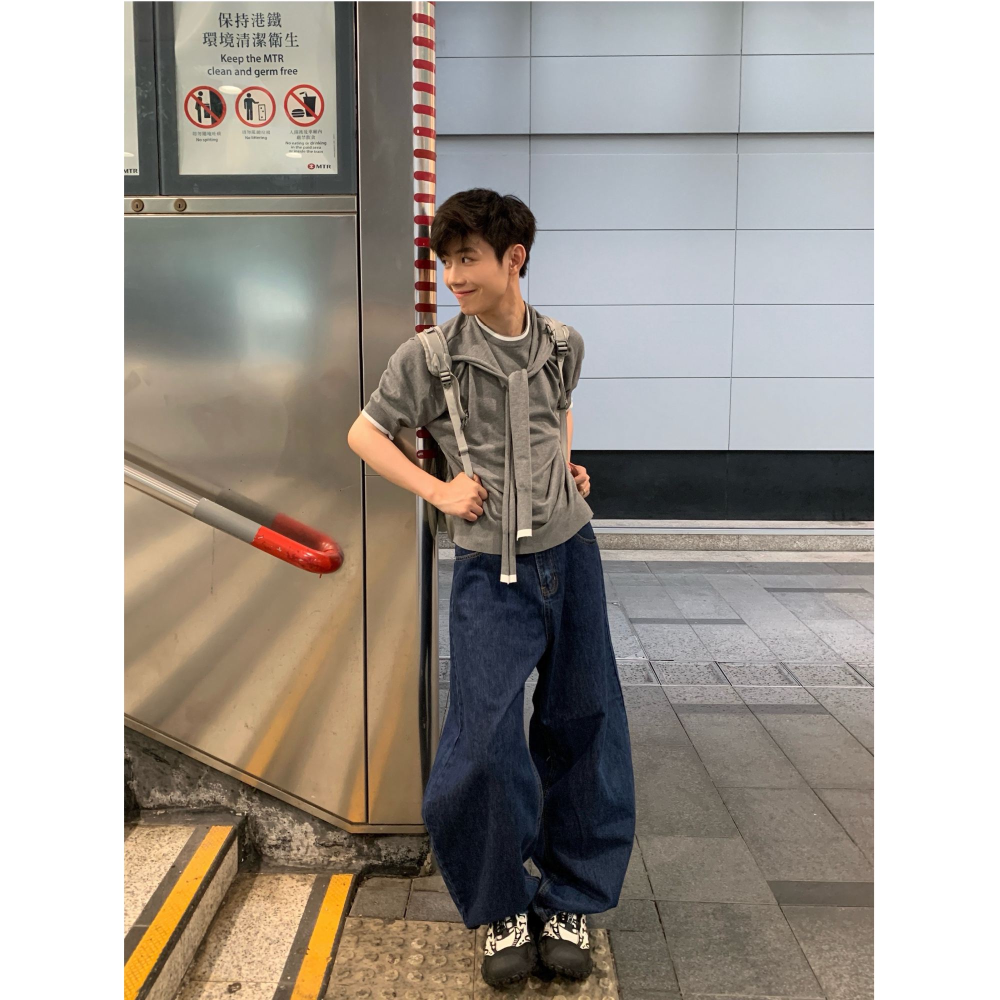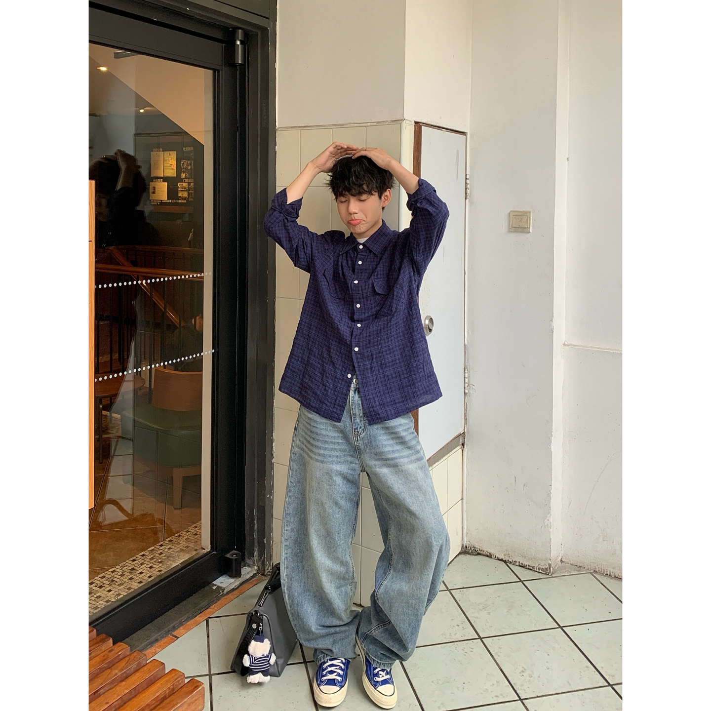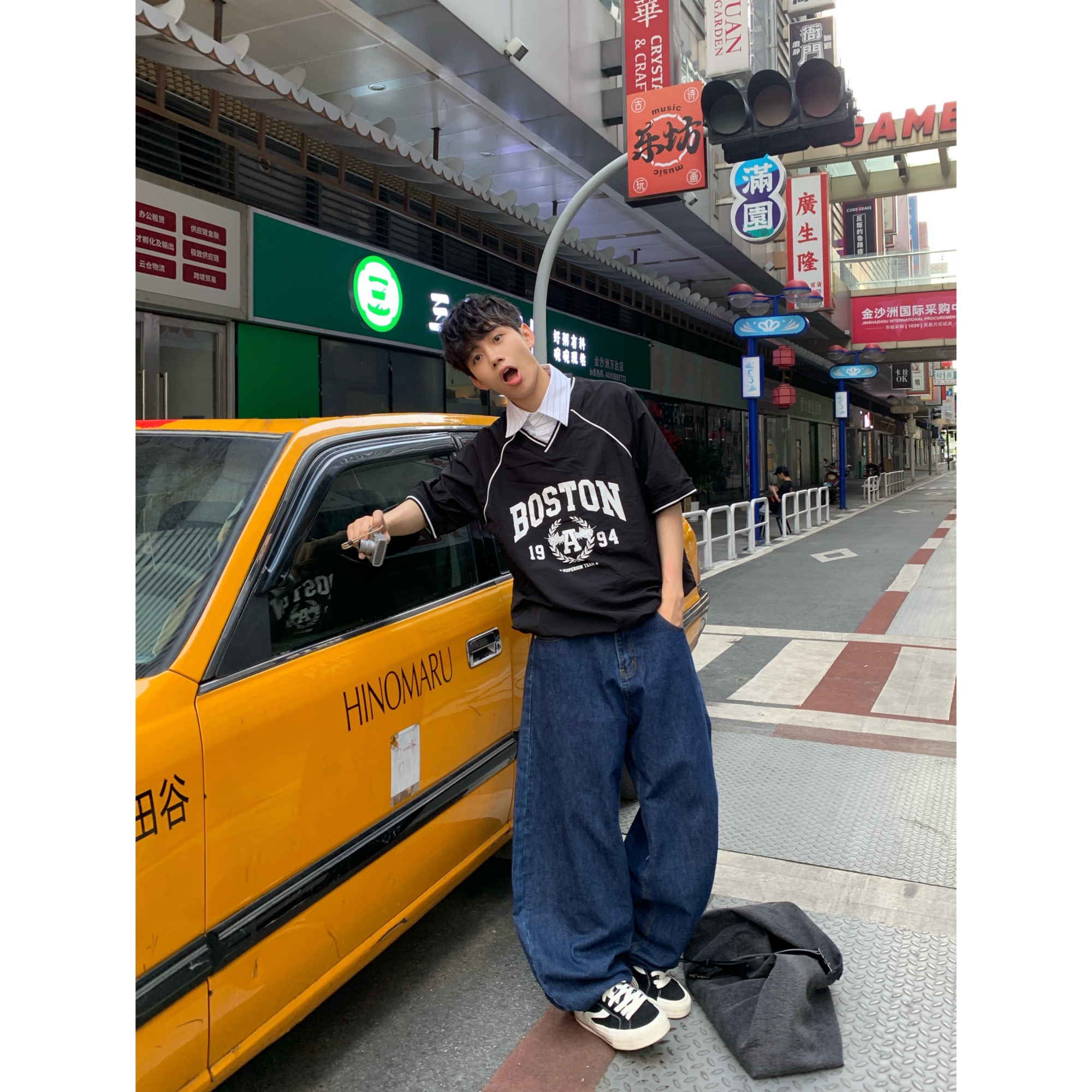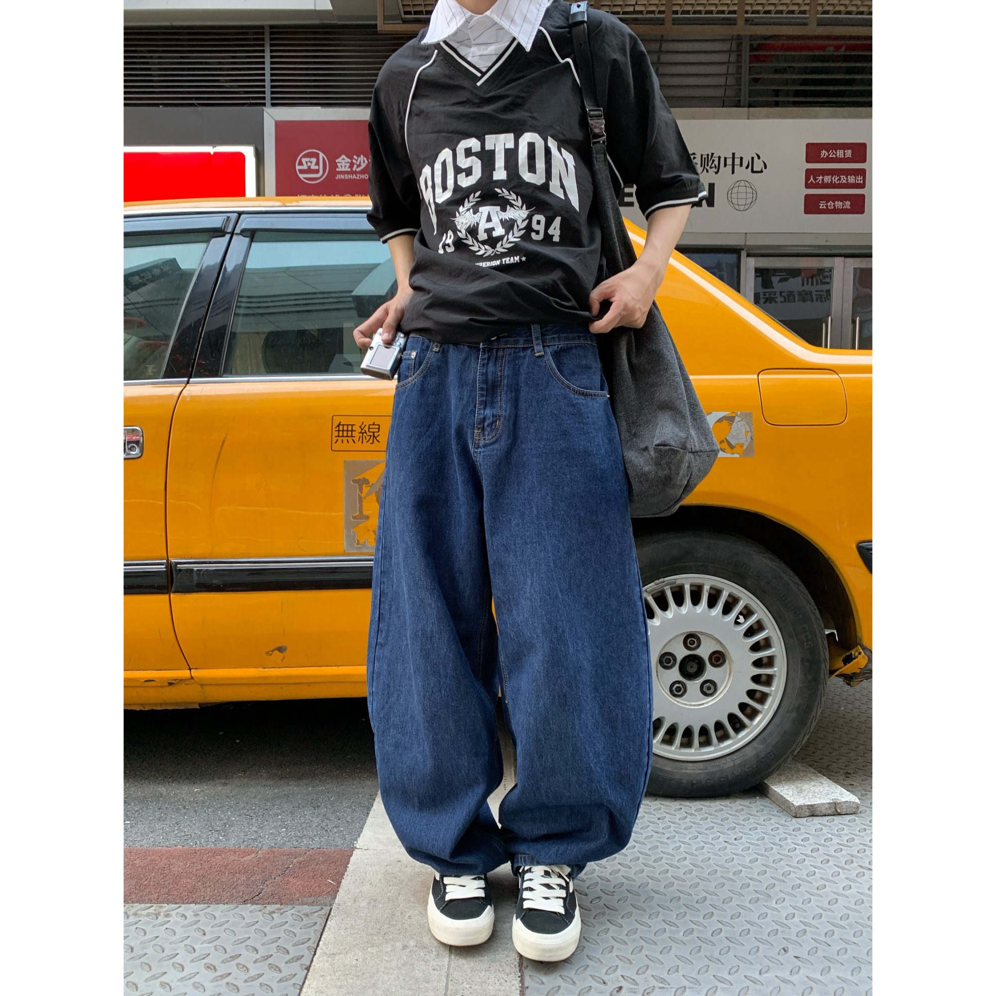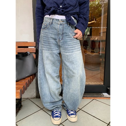 MeeLoo美式风复古弯刀水波纹牛仔裤男水洗阔腿裤宽松直筒做旧长裤