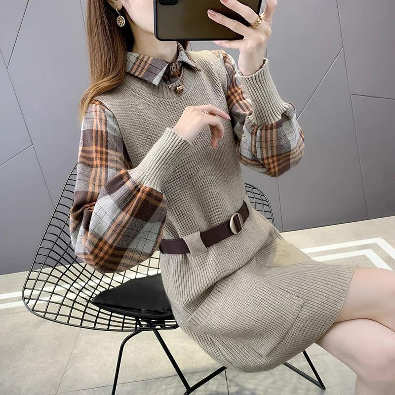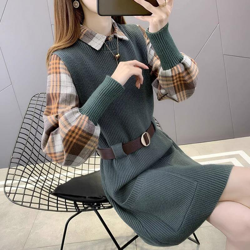 价格子衬衫毛衣马甲女时尚针织套装秋冬新款中长款收腰毛衣裙