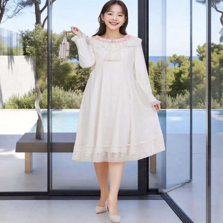 大码女装2025秋季新款百搭洋气胖mm中长圆领荷叶边温柔蕾丝连衣裙