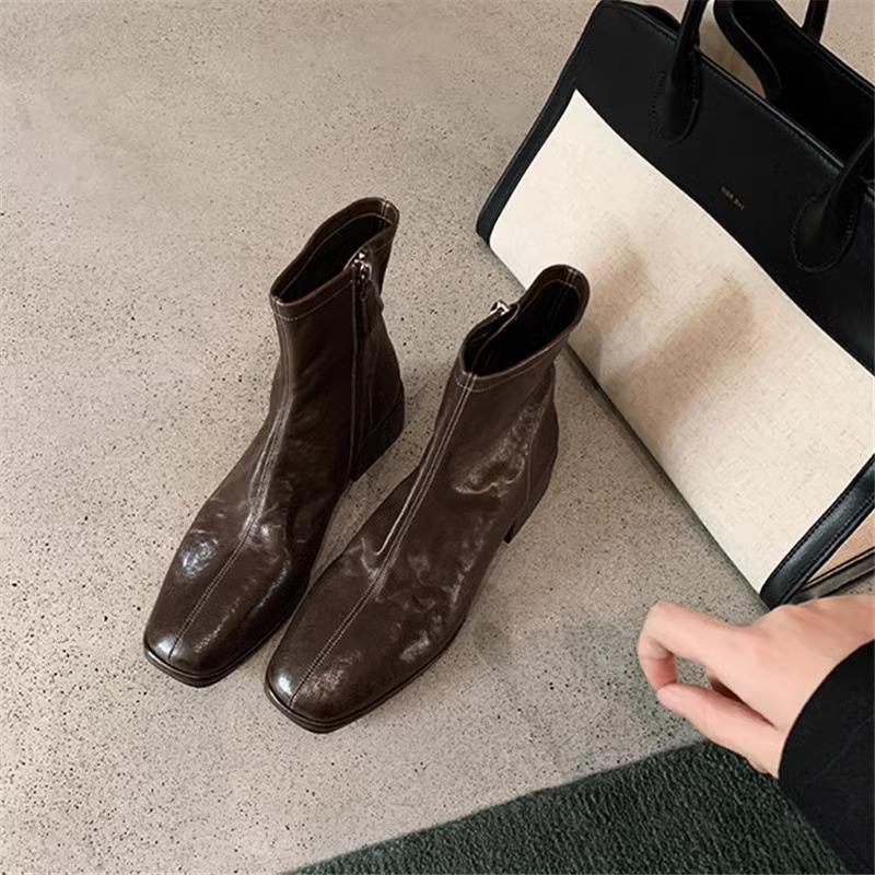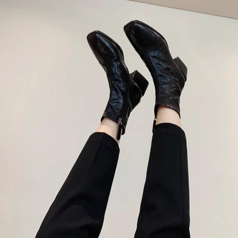 水洗牛皮~真皮方头复古瘦瘦靴短靴女粗跟小踝靴英伦风马丁靴单靴