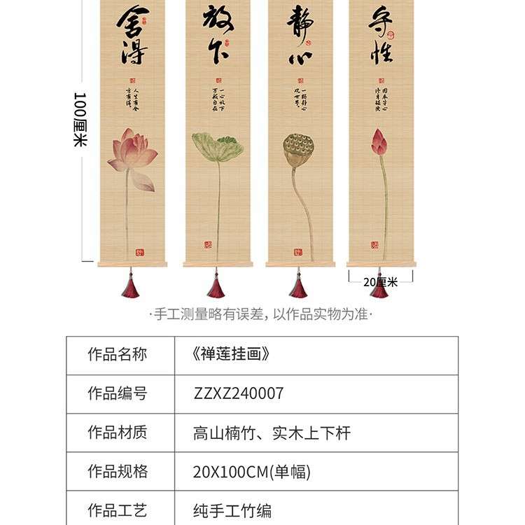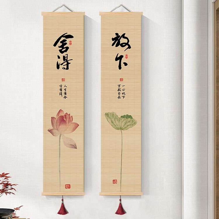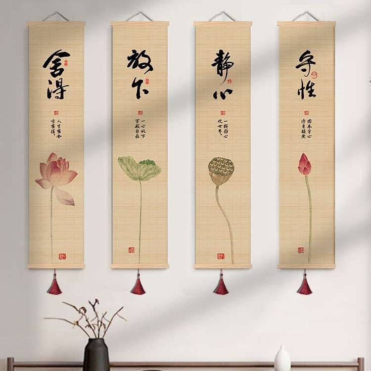 新中式客厅装饰画禅意茶室印花竹帘挂画书房背景卷轴书法荷花挂画