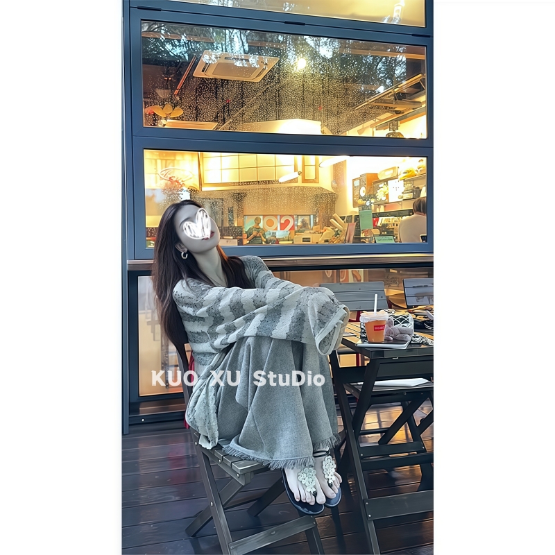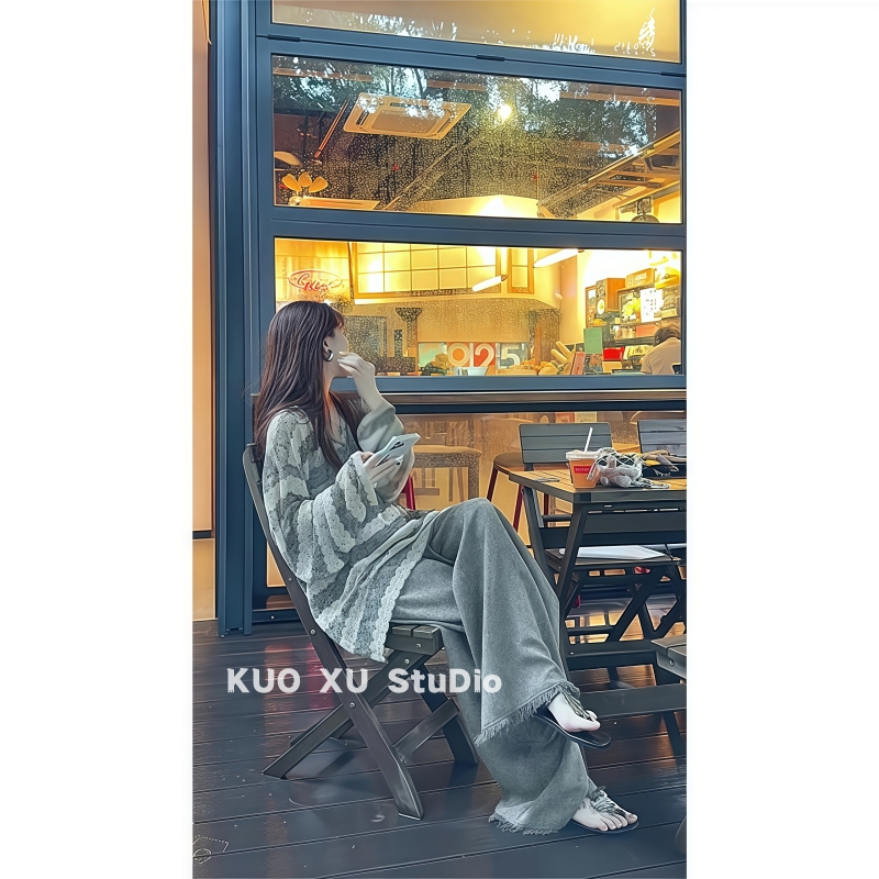 老钱风松弛感穿搭韩版条纹宽松百搭长袖上衣高腰休闲阔腿裤套装女
