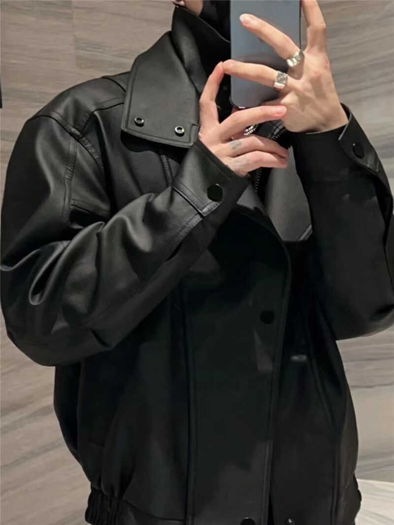 大翻领短款外套男士潮高级感轻熟风秋冬加棉皮衣痞帅爆款pu皮夹克