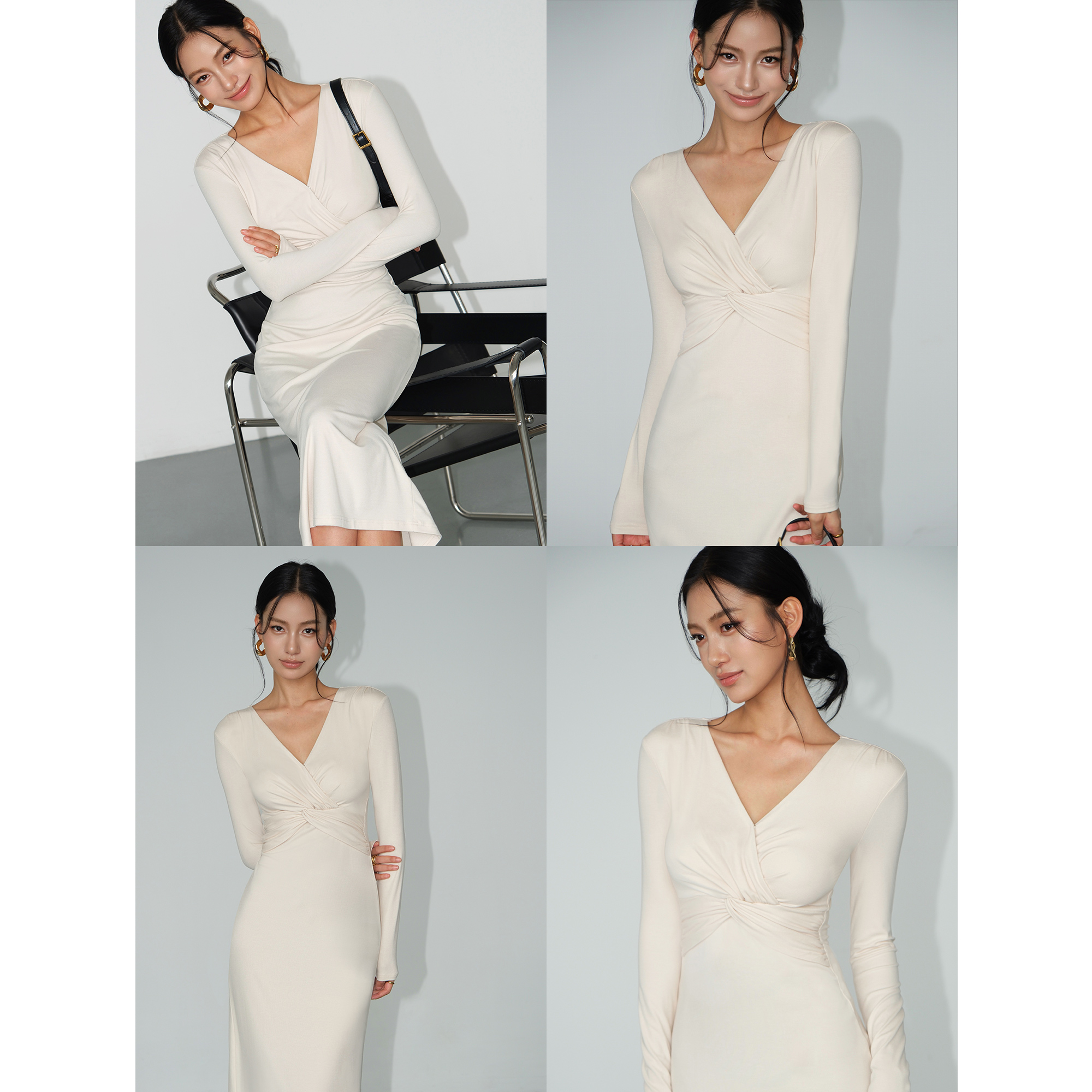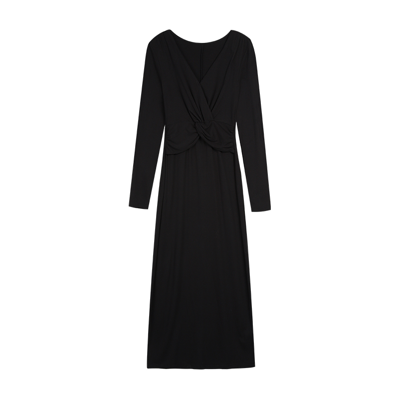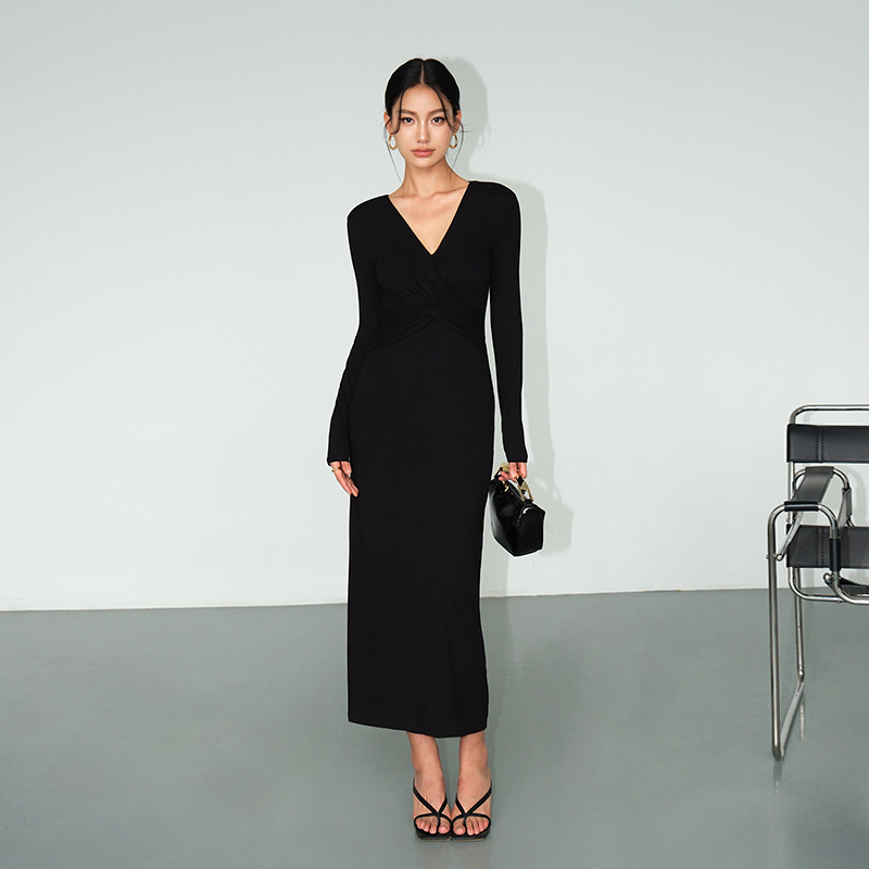 NEVA HU黑色法式V领连衣裙女设计感小众2025秋季修身气质包臀长裙