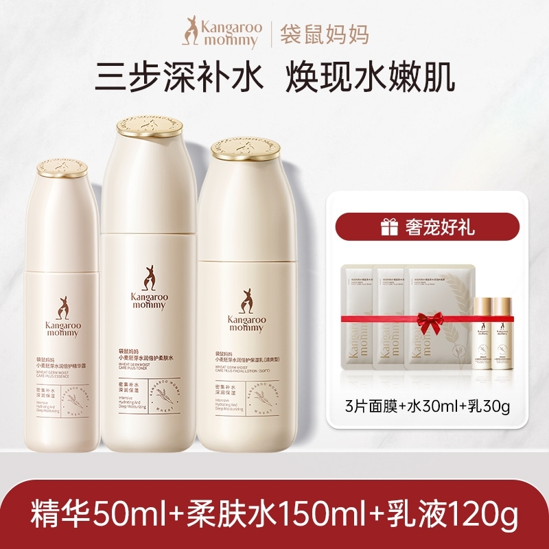 袋鼠妈妈孕妇护肤品小麦胚芽洗护三件套装孕保湿补水滋润面霜乳液