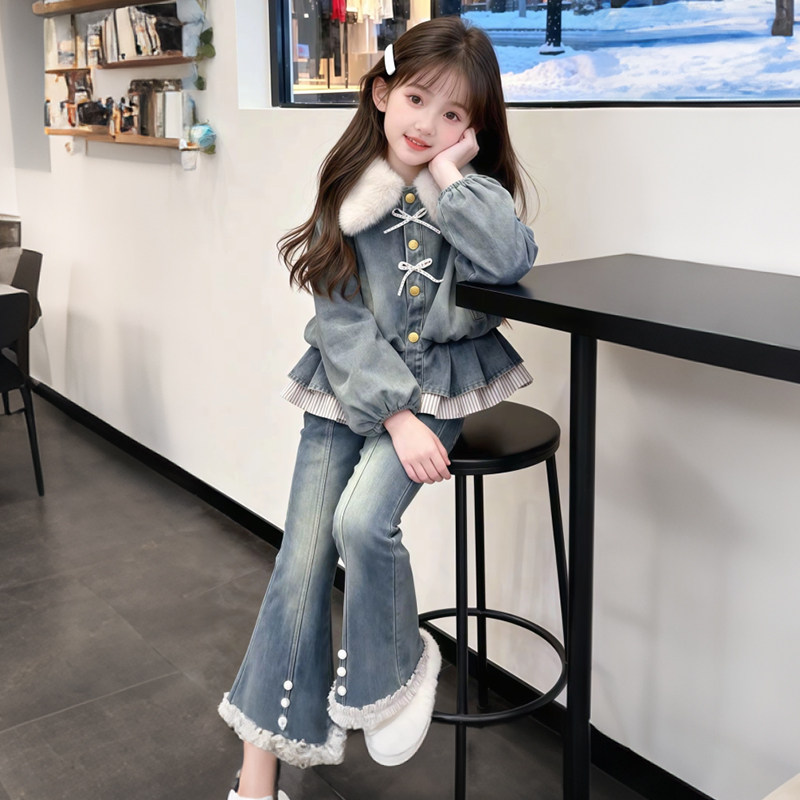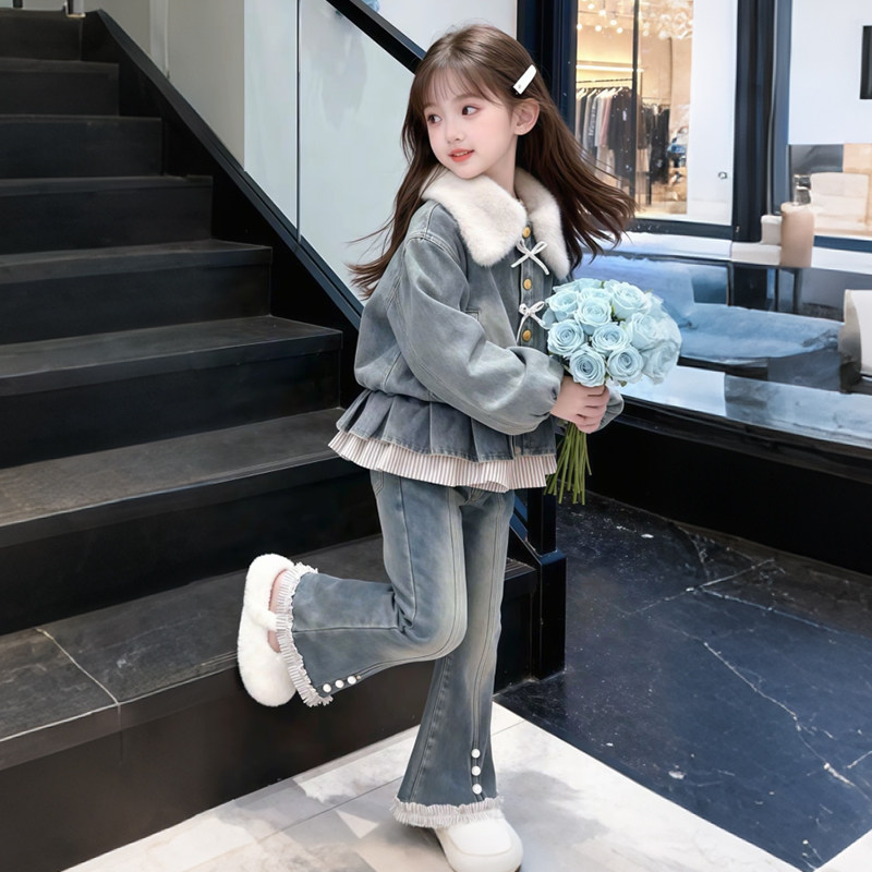 女童冬季牛仔套装加绒保暖两件套2025新款小女孩休闲洋气百搭冬装