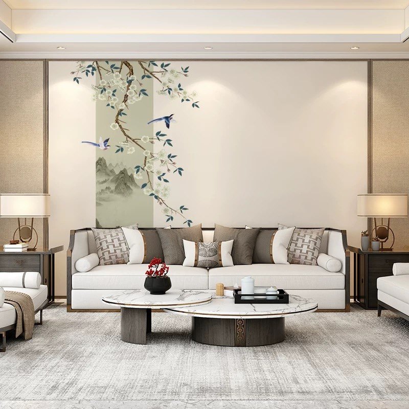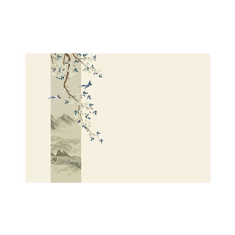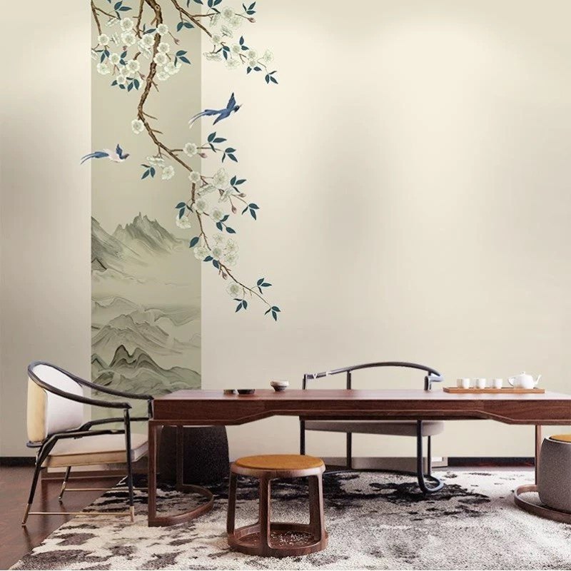 新中式淡雅山水花鸟墙纸电视沙发背景墙壁纸客厅卧室壁布茶室墙布