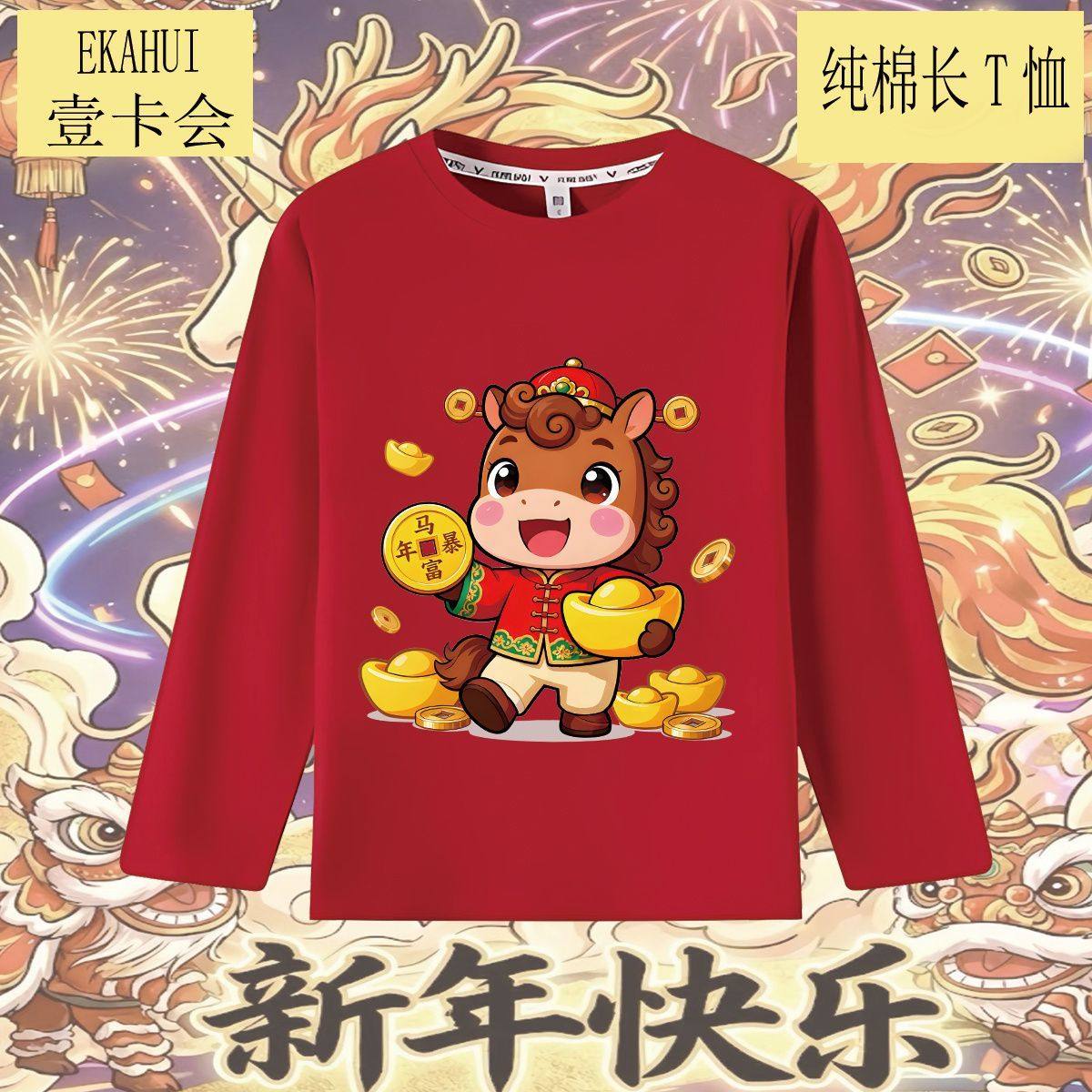 纯棉T恤2026马年儿童上衣春秋打底红色新年可爱亲子装长袖潮