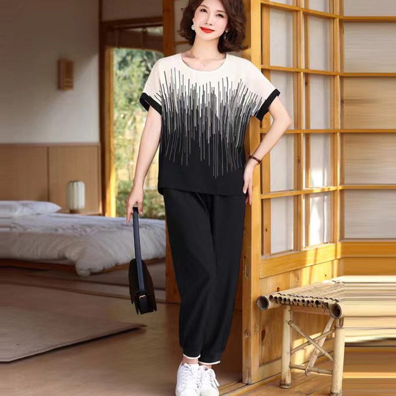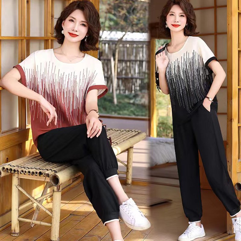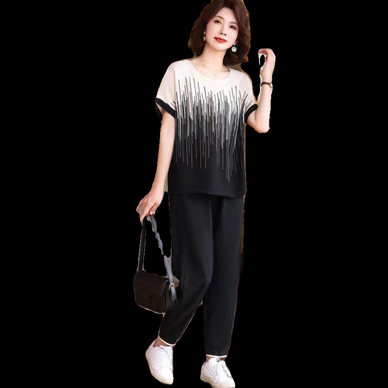 2024新款中年妈妈夏装套装中老年女装短袖T恤宽松洋气上衣两件套