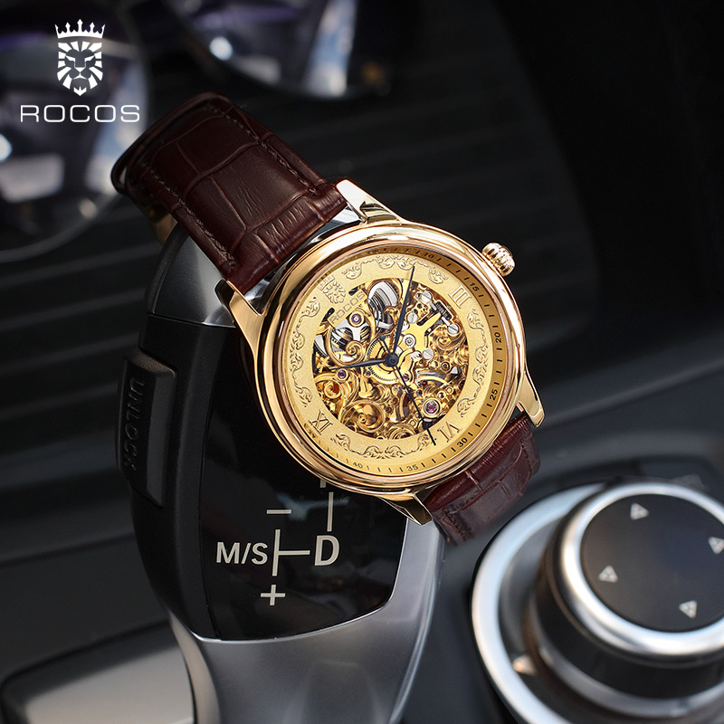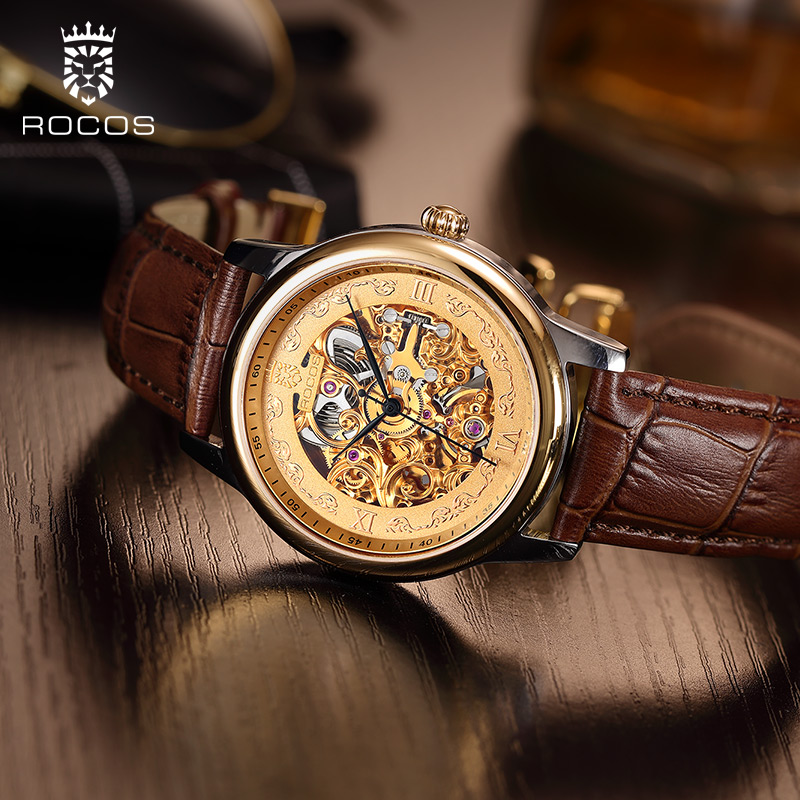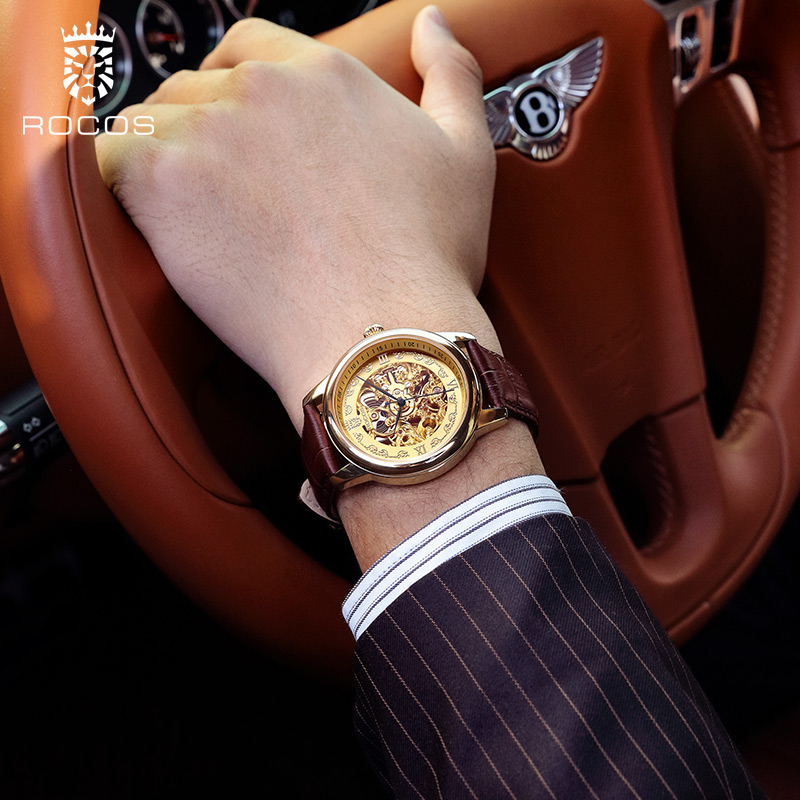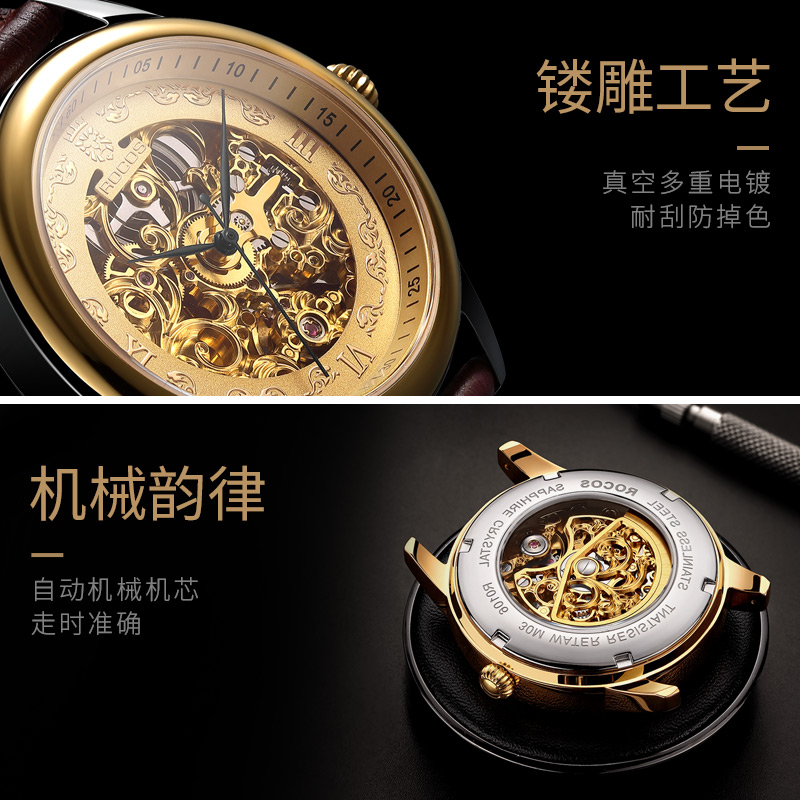 雷克斯ROCOS正品时尚休闲全自动机械表镂空皮带男士手表男表防水