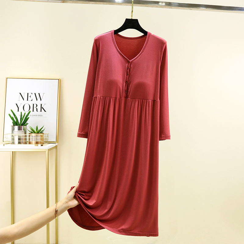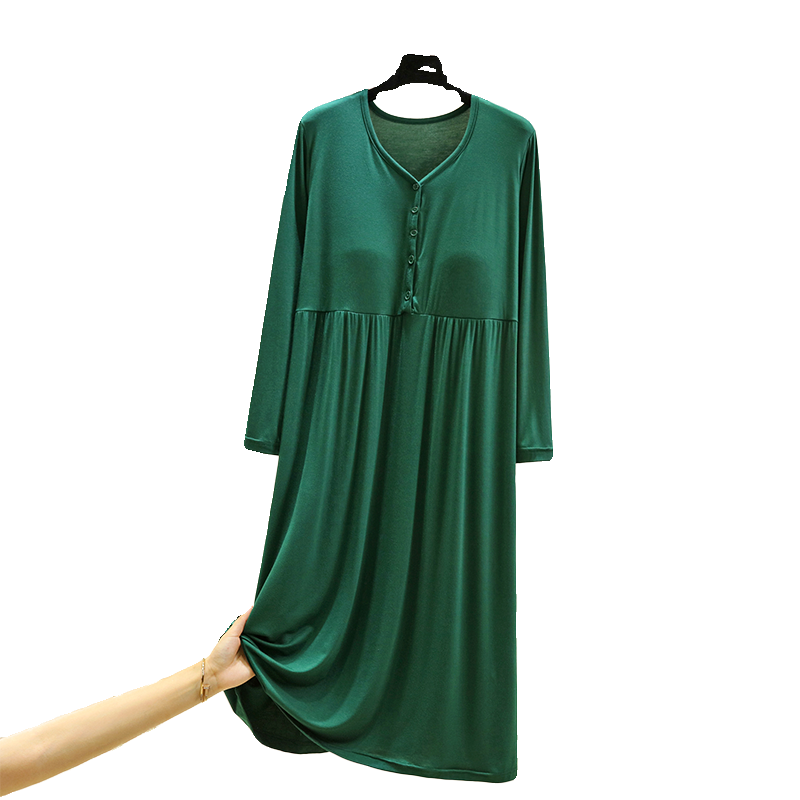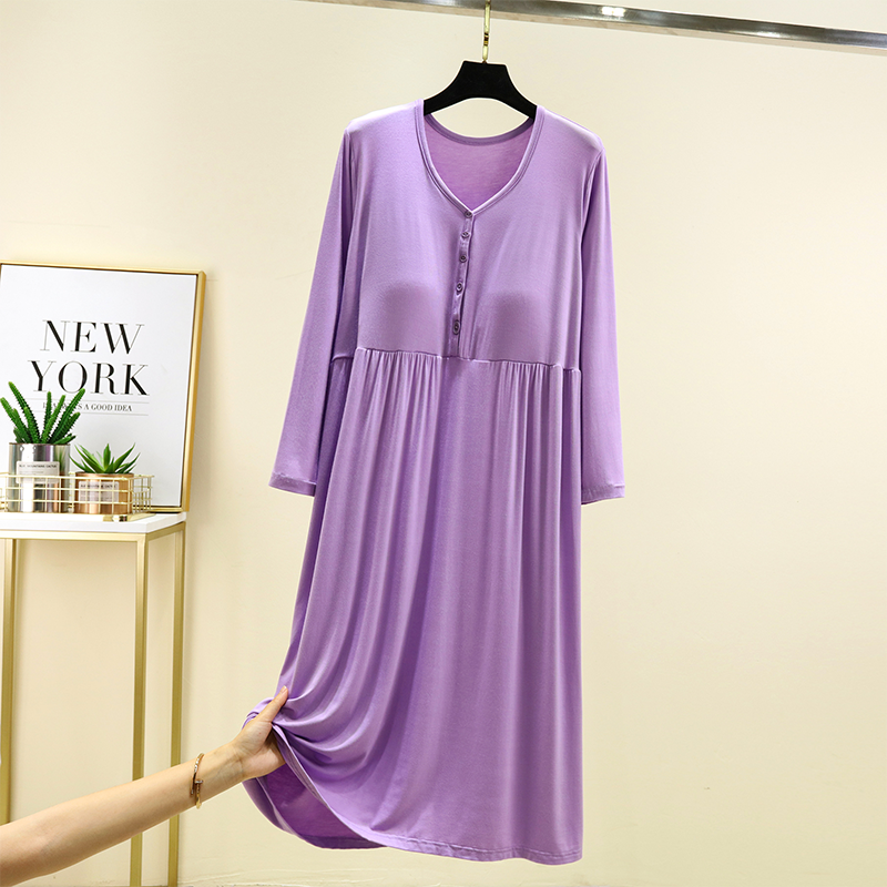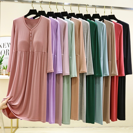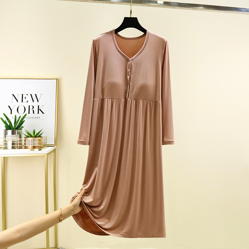 带胸垫家居裙女夏季可外穿莫代尔薄款长袖连衣裙纽扣中长过膝睡裙
