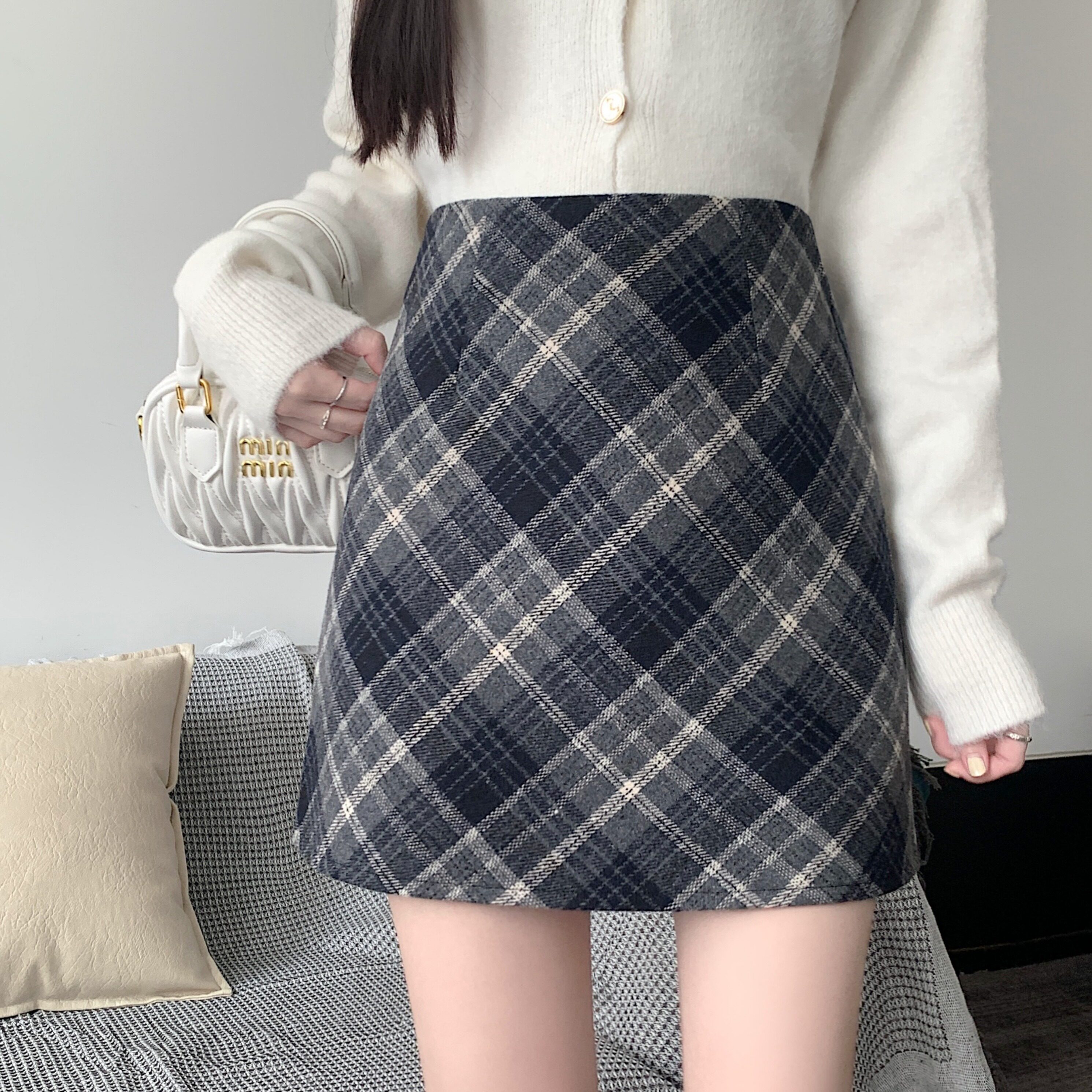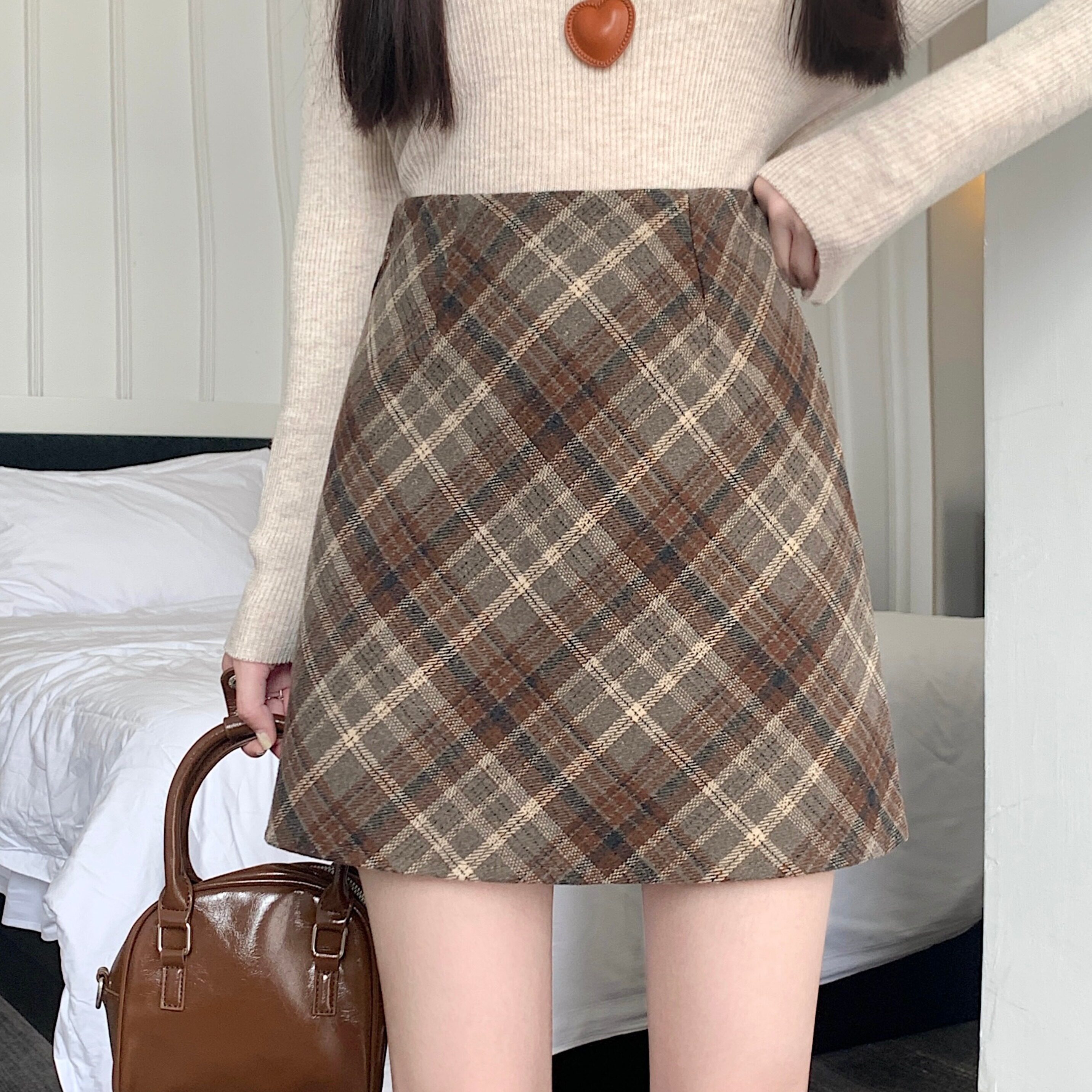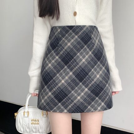 秋冬韩系毛呢半身裙女2025高腰a字显瘦修身包臀裙复古格子短裙子