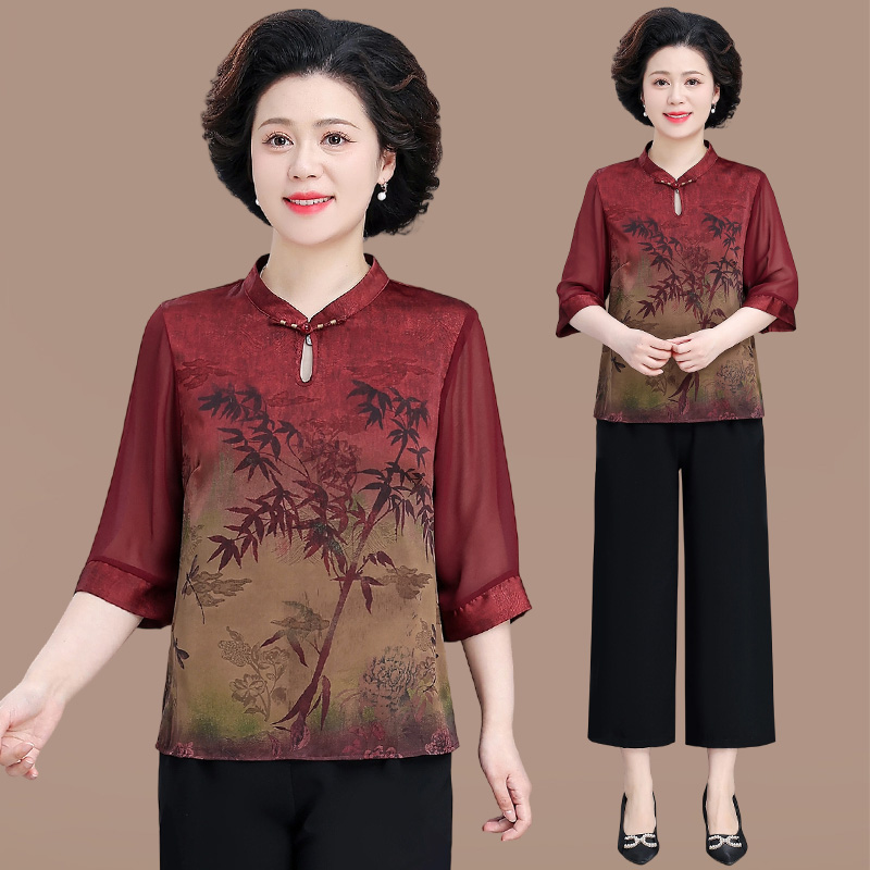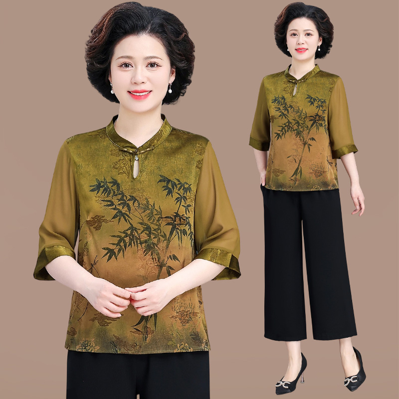 民族风印花拼接小衫阔腿裤两件套女中老年妈妈2025夏季时尚套装潮