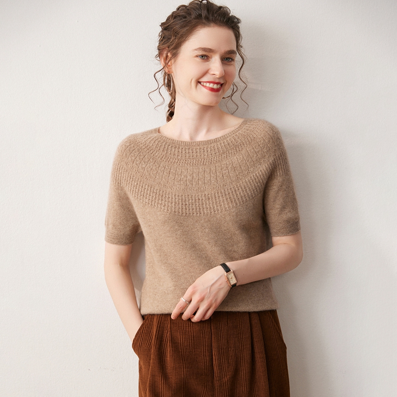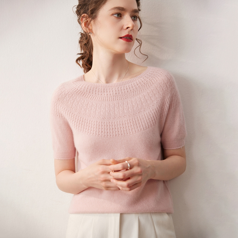 25年春夏新纯山羊绒针织短袖女圆领镂空宽松百搭洋气羊毛打底T恤