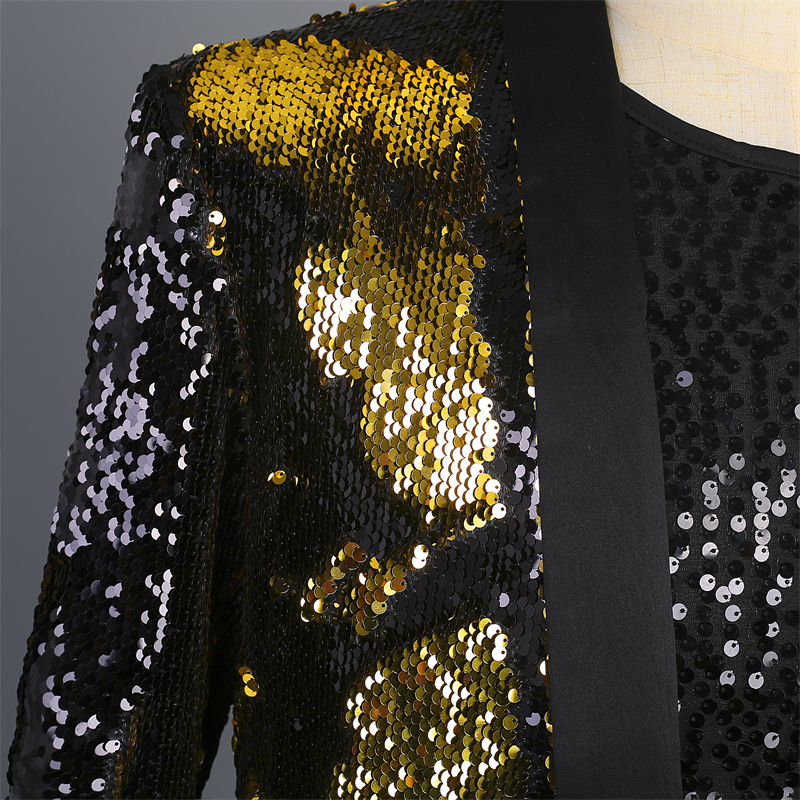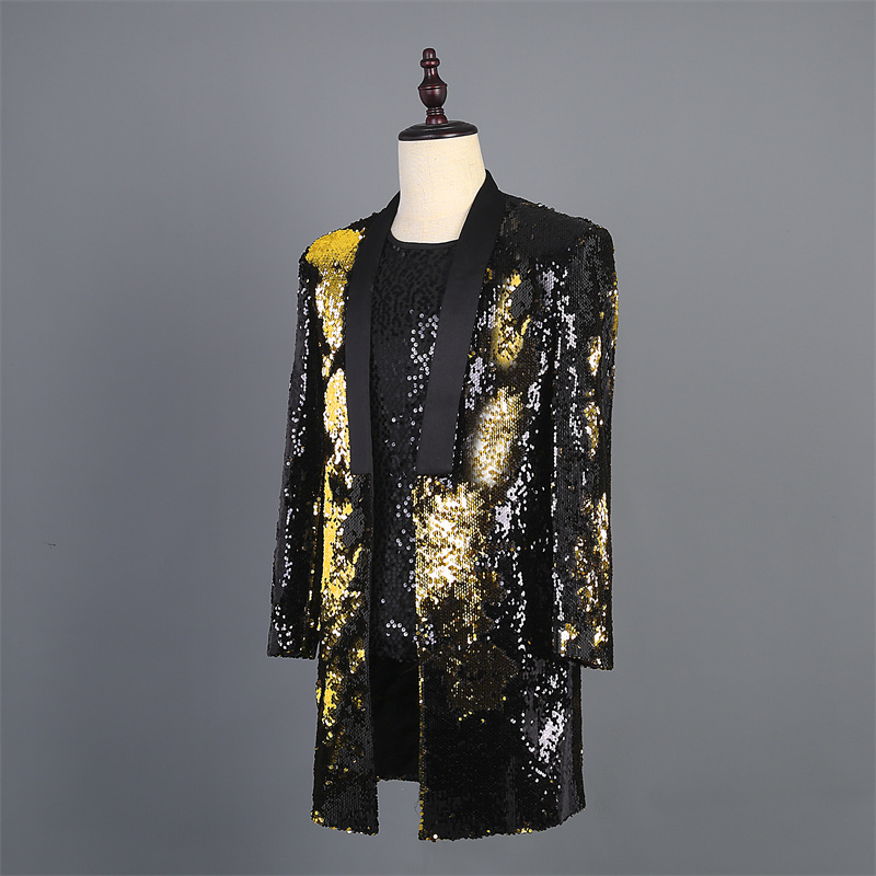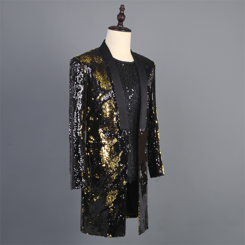 新品男黑金色青果领中长款亮片西装 春秋款男舞台变色休闲演出服