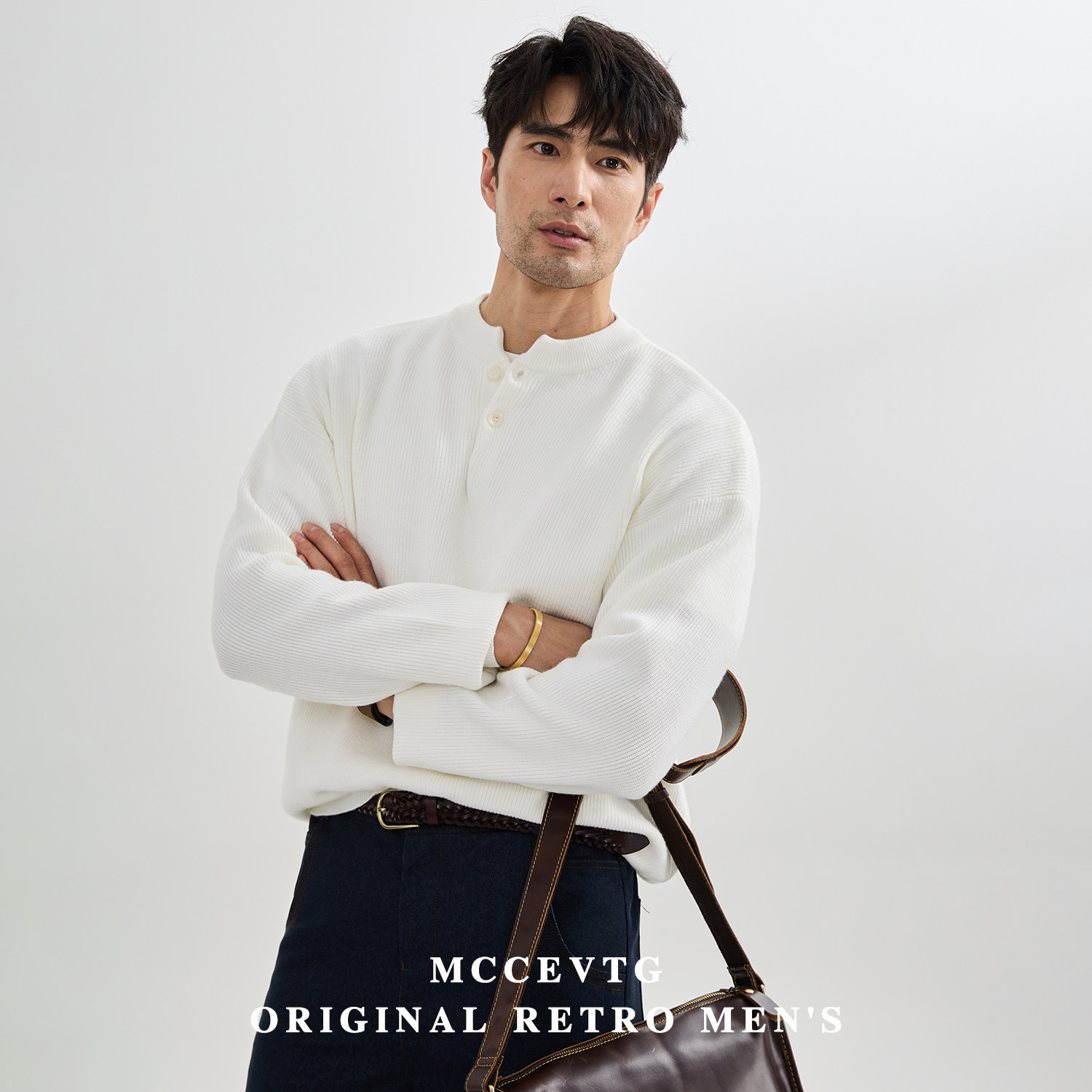 MCCEVTG抗起球休闲纯色亨利领毛衣男慵懒加厚保暖通勤针织衫冬季