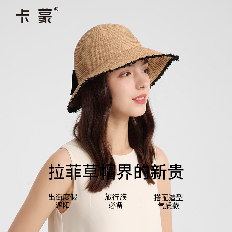 卡蒙加密编织超细拉菲草毛边高档防晒草帽女海边度假蝴蝶结遮阳帽
