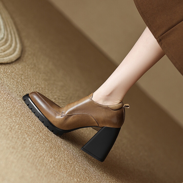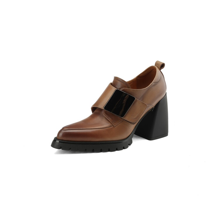 超高跟时尚粗跟单鞋女2025秋季新款软皮尖头皮带扣复古深口小皮鞋