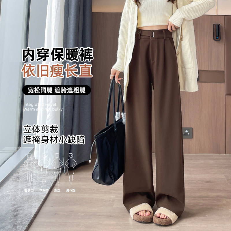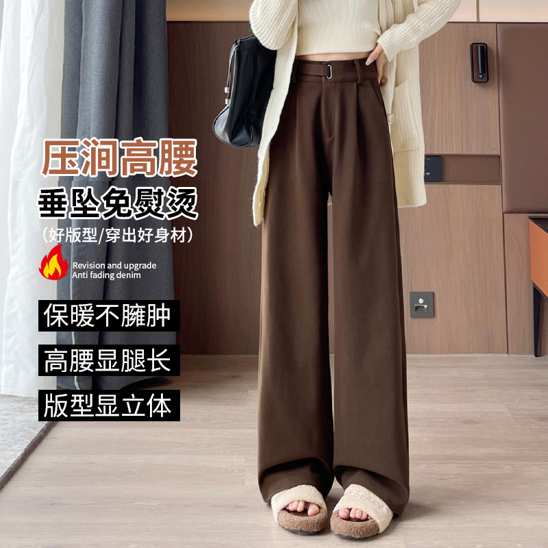 毛呢阔腿裤女咖色秋冬新款通勤加绒加厚垂感小个子窄版直筒西装裤