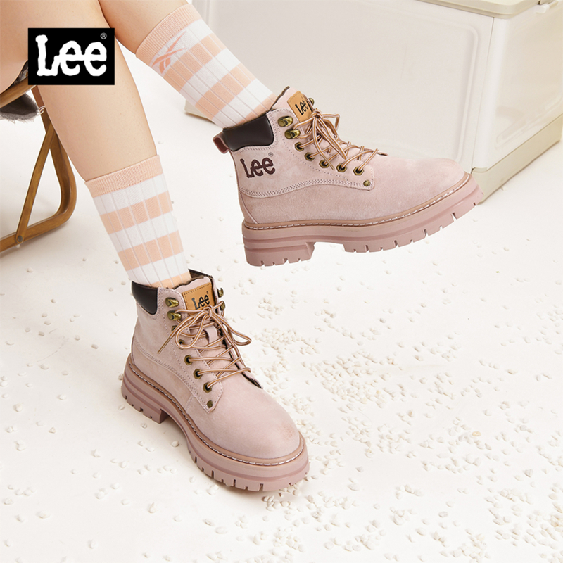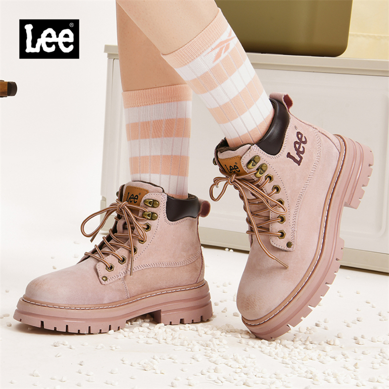 Lee官方女鞋冬季新款加绒马丁靴女士粉色短靴厚底工装靴保暖靴子