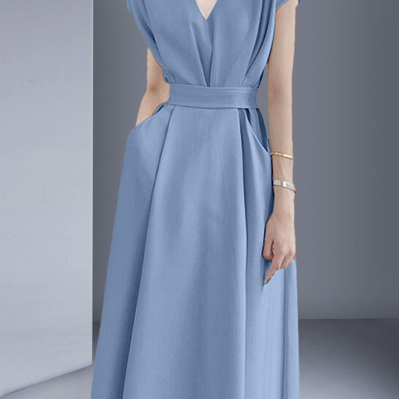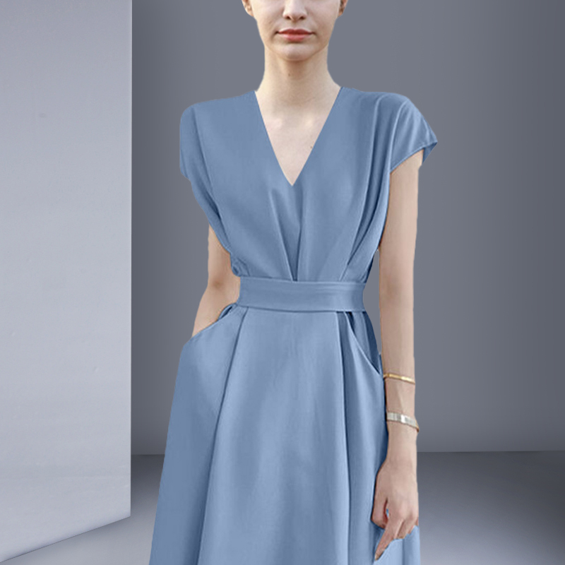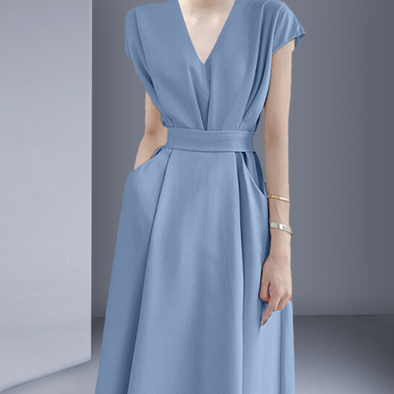 2025夏季新款V领法式高腰显瘦设计感赫本风温柔连衣裙中长裙轻奢
