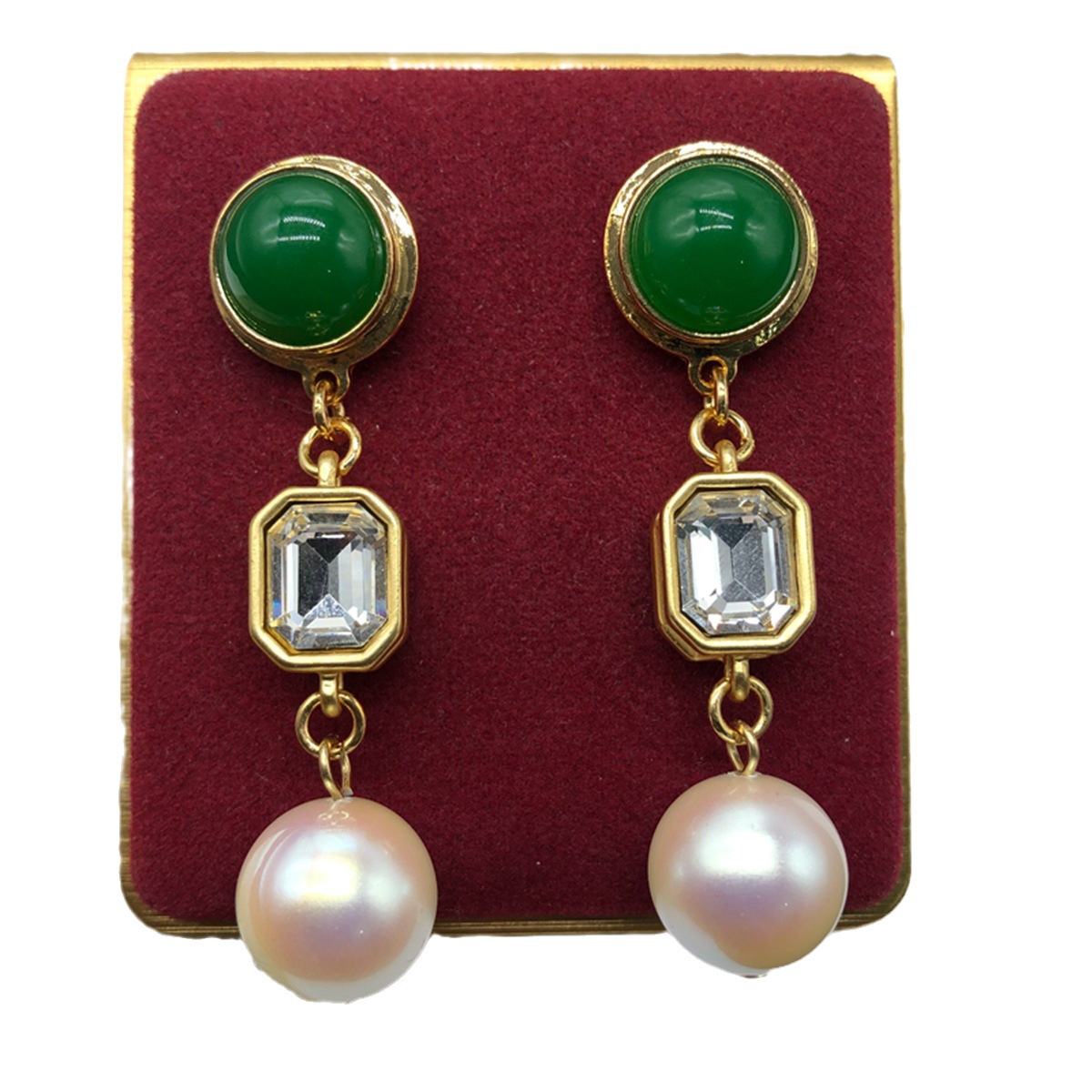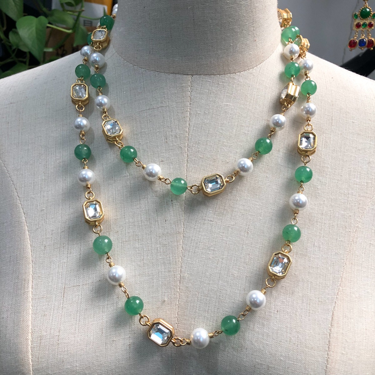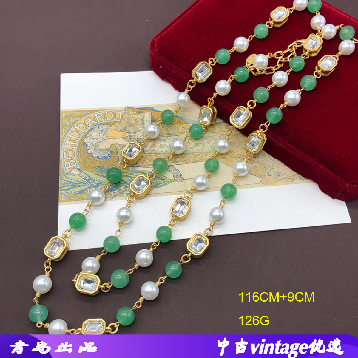 中古绿色琉璃珍珠长款短款项链耳环镀真金切面宝石毛衣链耳环套装