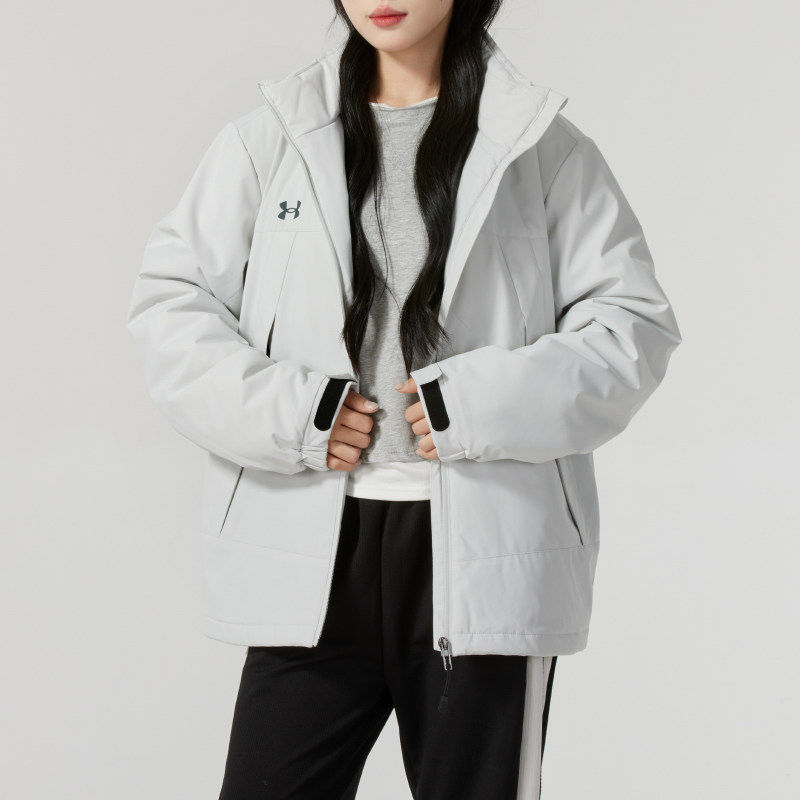 UA安德玛防泼水短款棉服男装女装2026春季新款浅灰色立领保暖外套