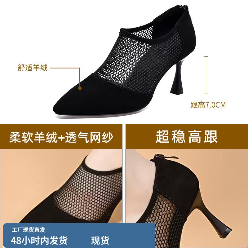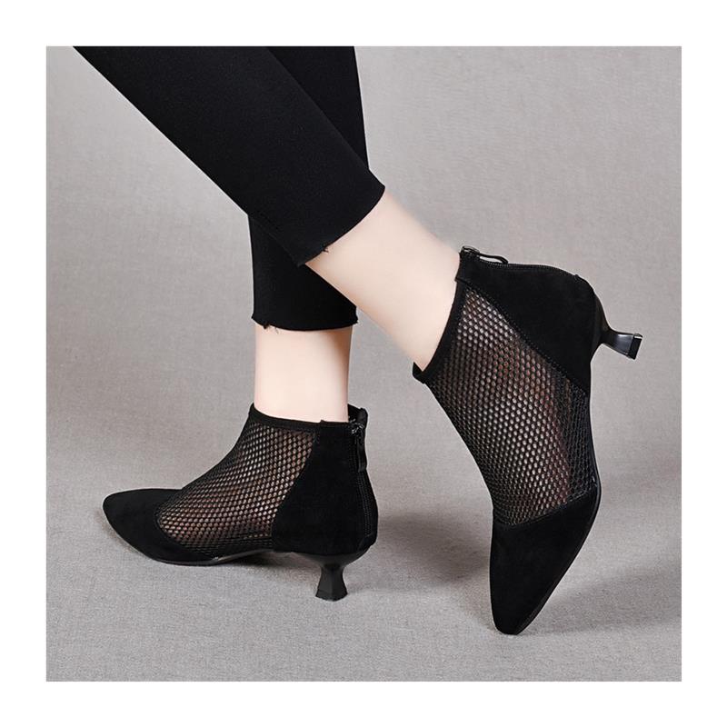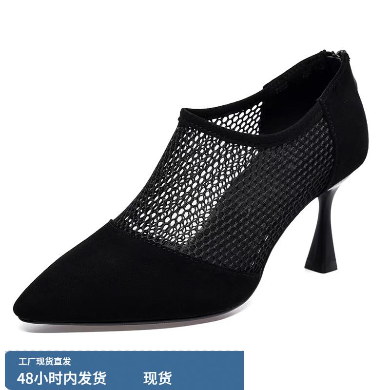 2025年春夏新款凉鞋女真皮网纱拼接罗马凉靴尖头细高跟后拉链女鞋